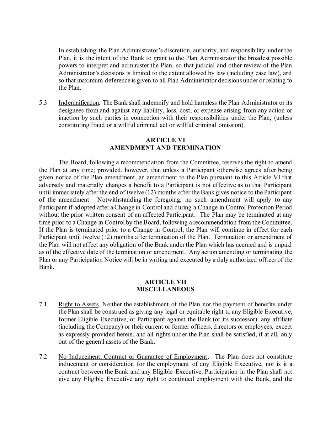 In establishing the Plan Administrator’s discretion, authority, and responsibility under the Plan, it is the intent of the Bank to grant to the Plan Administrator the broadest possible powers to interpret and administer the Plan, so that judicial and other review of the Plan Administrator’s decisions is limited to the extent allowed by law (including case law), and so that maximum deference is given to all Plan Administrator decisions under or relating to the Plan. 5.3 Indemnification. The Bank shall indemnify and hold harmless the Plan Administrator or its designees from and against any liability, loss, cost, or expense arising from any action or inaction by such parties in connection with their responsibilities under the Plan, (unless constituting fraud or a willful criminal act or willful criminal omission). ARTICLE VI AMENDMENT AND TERMINATION The Board, following a recommendation from the Committee, reserves the right to amend the Plan at any time; provided, however, that unless a Participant otherwise agrees after being given notice of the Plan amendment, an amendment to the Plan pursuant to this Article VI that adversely and materially changes a benefit to a Participant is not effective as to that Participant until immediately after the end of twelve (12) months after the Bank gives notice to the Participant of the amendment. Notwithstanding the foregoing, no such amendment will apply to any Participant if adopted after a Change in Control and during a Change in Control Protection Period without the prior written consent of an affected Participant. The Plan may be terminated at any time prior to a Change in Control by the Board, following a recommendation from the Committee. If the Plan is terminated prior to a Change in Control, the Plan will continue in effect for each Participant until twelve (12) months after termination of the Plan. Termination or amendment of the Plan will not affect any obligation of the Bank under the Plan which has accrued and is unpaid as of the effective date of the termination or amendment. Any action amending or terminating the Plan or any Participation Notice will be in writing and executed by a duly authorized officer of the Bank. ARTICLE VII MISCELLANEOUS 7.1 Right to Assets. Neither the establishment of the Plan nor the payment of benefits under the Plan shall be construed as giving any legal or equitable right to any Eligible Executive, former Eligible Executive, or Participant against the Bank (or its successor), any affiliate (including the Company) or their current or former officers, directors or employees, except as expressly provided herein, and all rights under the Plan shall be satisfied, if at all, only out of the general assets of the Bank. 7.2 No Inducement, Contract or Guarantee of Employment. The Plan does not constitute inducement or consideration for the employment of any Eligible Executive, nor is it a contract between the Bank and any Eligible Executive. Participation in the Plan shall not give any Eligible Executive any right to continued employment with the Bank, and the