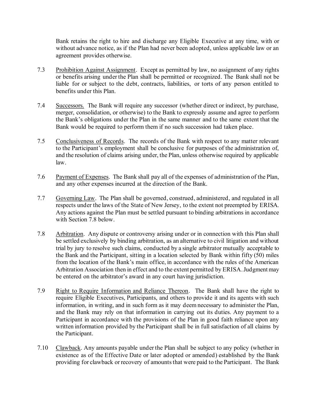 Bank retains the right to hire and discharge any Eligible Executive at any time, with or without advance notice, as if the Plan had never been adopted, unless applicable law or an agreement provides otherwise. 7.3 Prohibition Against Assignment. Except as permitted by law, no assignment of any rights or benefits arising under the Plan shall be permitted or recognized. The Bank shall not be liable for or subject to the debt, contracts, liabilities, or torts of any person entitled to benefits under this Plan. 7.4 Successors. The Bank will require any successor (whether direct or indirect, by purchase, merger, consolidation, or otherwise) to the Bank to expressly assume and agree to perform the Bank’s obligations under the Plan in the same manner and to the same extent that the Bank would be required to perform them if no such succession had taken place. 7.5 Conclusiveness of Records. The records of the Bank with respect to any matter relevant to the Participant’s employment shall be conclusive for purposes of the administration of, and the resolution of claims arising under, the Plan, unless otherwise required by applicable law. 7.6 Payment of Expenses. The Bank shall pay all of the expenses of administration of the Plan, and any other expenses incurred at the direction of the Bank. 7.7 Governing Law. The Plan shall be governed, construed, administered, and regulated in all respects under the laws of the State of New Jersey, to the extent not preempted by ERISA. Any actions against the Plan must be settled pursuant to binding arbitrations in accordance with Section 7.8 below. 7.8 Arbitration. Any dispute or controversy arising under or in connection with this Plan shall be settled exclusively by binding arbitration, as an alternative to civil litigation and without trial by jury to resolve such claims, conducted by a single arbitrator mutually acceptable to the Bank and the Participant, sitting in a location selected by Bank within fifty (50) miles from the location of the Bank’s main office, in accordance with the rules of the American Arbitration Association then in effect and to the extent permitted by ERISA. Judgment may be entered on the arbitrator’s award in any court having jurisdiction. 7.9 Right to Require Information and Reliance Thereon. The Bank shall have the right to require Eligible Executives, Participants, and others to provide it and its agents with such information, in writing, and in such form as it may deem necessary to administer the Plan, and the Bank may rely on that information in carrying out its duties. Any payment to a Participant in accordance with the provisions of the Plan in good faith reliance upon any written information provided by the Participant shall be in full satisfaction of all claims by the Participant. 7.10 Clawback. Any amounts payable under the Plan shall be subject to any policy (whether in existence as of the Effective Date or later adopted or amended) established by the Bank providing for clawback or recovery of amounts that were paid to the Participant. The Bank