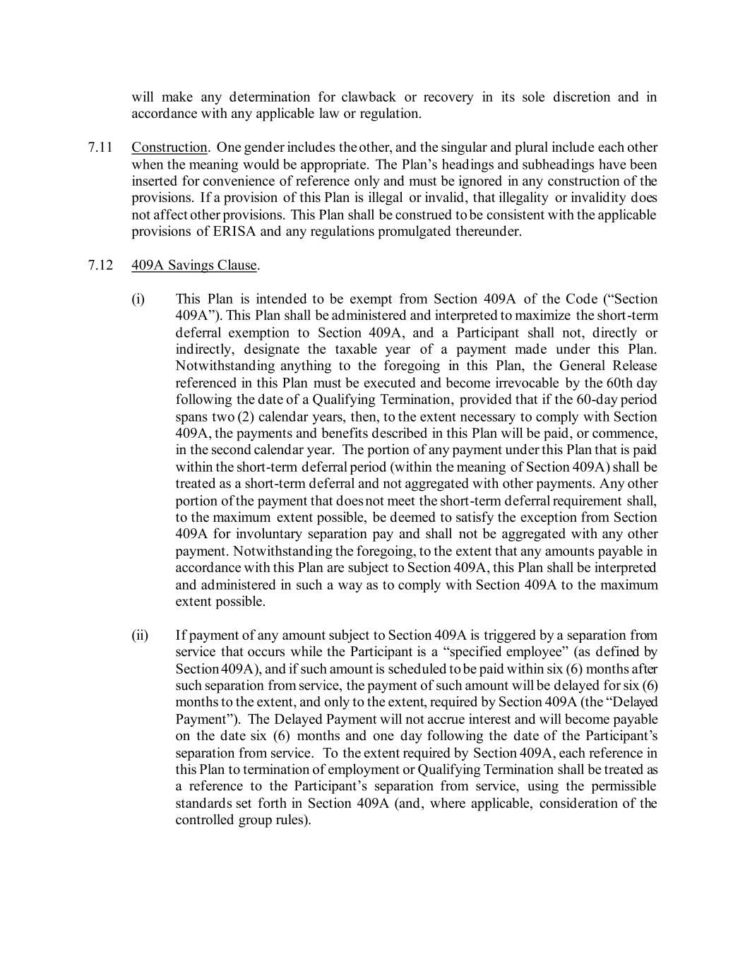 will make any determination for clawback or recovery in its sole discretion and in accordance with any applicable law or regulation. 7.11 Construction. One gender includes the other, and the singular and plural include each other when the meaning would be appropriate. The Plan’s headings and subheadings have been inserted for convenience of reference only and must be ignored in any construction of the provisions. If a provision of this Plan is illegal or invalid, that illegality or invalidity does not affect other provisions. This Plan shall be construed to be consistent with the applicable provisions of ERISA and any regulations promulgated thereunder. 7.12 409A Savings Clause. (i) This Plan is intended to be exempt from Section 409A of the Code (“Section 409A”). This Plan shall be administered and interpreted to maximize the short-term deferral exemption to Section 409A, and a Participant shall not, directly or indirectly, designate the taxable year of a payment made under this Plan. Notwithstanding anything to the foregoing in this Plan, the General Release referenced in this Plan must be executed and become irrevocable by the 60th day following the date of a Qualifying Termination, provided that if the 60-day period spans two (2) calendar years, then, to the extent necessary to comply with Section 409A, the payments and benefits described in this Plan will be paid, or commence, in the second calendar year. The portion of any payment under this Plan that is paid within the short-term deferral period (within the meaning of Section 409A) shall be treated as a short-term deferral and not aggregated with other payments. Any other portion of the payment that does not meet the short-term deferral requirement shall, to the maximum extent possible, be deemed to satisfy the exception from Section 409A for involuntary separation pay and shall not be aggregated with any other payment. Notwithstanding the foregoing, to the extent that any amounts payable in accordance with this Plan are subject to Section 409A, this Plan shall be interpreted and administered in such a way as to comply with Section 409A to the maximum extent possible. (ii) If payment of any amount subject to Section 409A is triggered by a separation from service that occurs while the Participant is a “specified employee” (as defined by Section 409A), and if such amount is scheduled to be paid within six (6) months after such separation from service, the payment of such amount will be delayed for six (6) months to the extent, and only to the extent, required by Section 409A (the “Delayed Payment”). The Delayed Payment will not accrue interest and will become payable on the date six (6) months and one day following the date of the Participant’s separation from service. To the extent required by Section 409A, each reference in this Plan to termination of employment or Qualifying Termination shall be treated as a reference to the Participant’s separation from service, using the permissible standards set forth in Section 409A (and, where applicable, consideration of the controlled group rules).