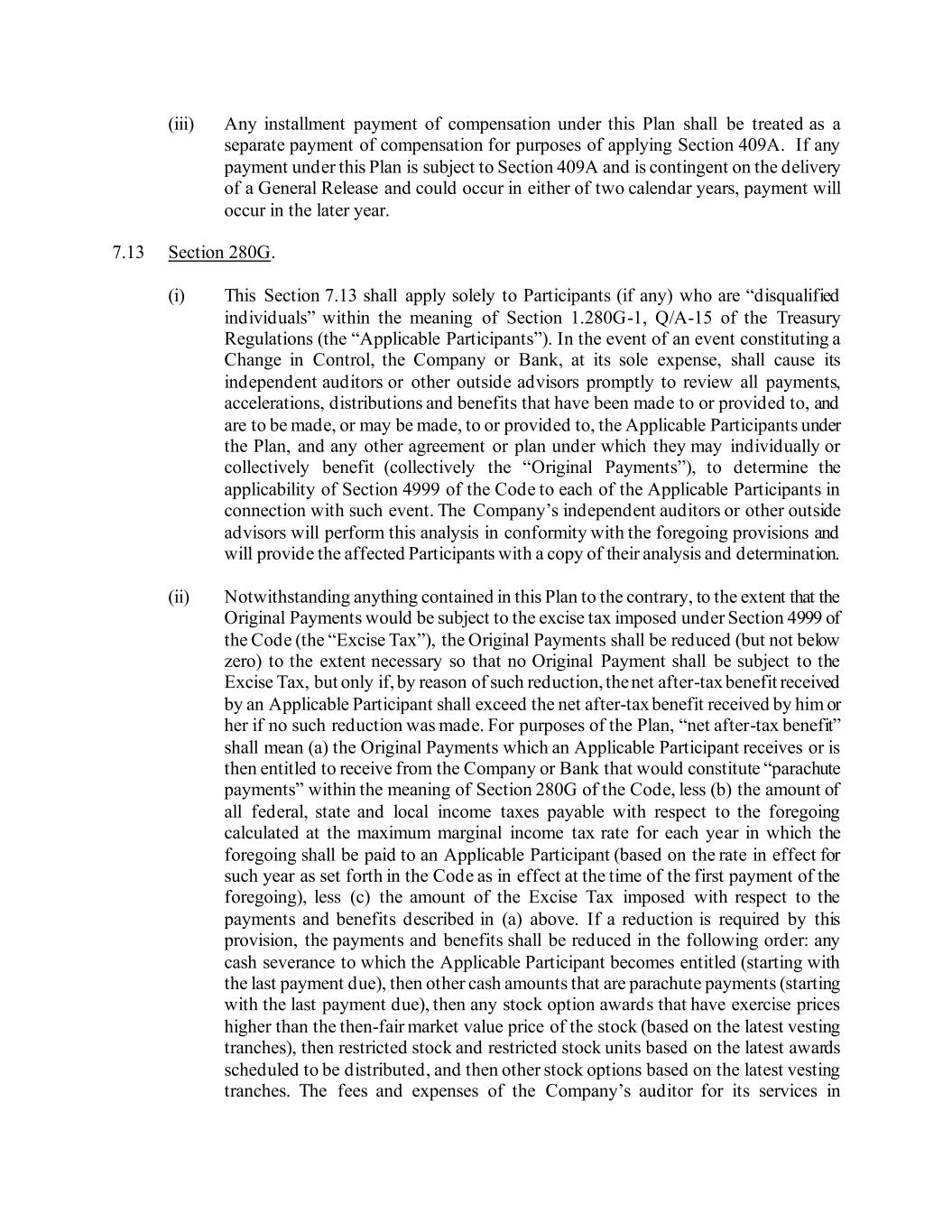 (iii) Any installment payment of compensation under this Plan shall be treated as a separate payment of compensation for purposes of applying Section 409A. If any payment under this Plan is subject to Section 409A and is contingent on the delivery of a General Release and could occur in either of two calendar years, payment will occur in the later year. 7.13 Section 280G. (i) This Section 7.13 shall apply solely to Participants (if any) who are “disqualified individuals” within the meaning of Section 1.280G-1, Q/A-15 of the Treasury Regulations (the “Applicable Participants”). In the event of an event constituting a Change in Control, the Company or Bank, at its sole expense, shall cause its independent auditors or other outside advisors promptly to review all payments, accelerations, distributions and benefits that have been made to or provided to, and are to be made, or may be made, to or provided to, the Applicable Participants under the Plan, and any other agreement or plan under which they may individually or collectively benefit (collectively the “Original Payments”), to determine the applicability of Section 4999 of the Code to each of the Applicable Participants in connection with such event. The Company’s independent auditors or other outside advisors will perform this analysis in conformity with the foregoing provisions and will provide the affected Participants with a copy of their analysis and determination. (ii) Notwithstanding anything contained in this Plan to the contrary, to the extent that the Original Payments would be subject to the excise tax imposed under Section 4999 of the Code (the “Excise Tax”), the Original Payments shall be reduced (but not below zero) to the extent necessary so that no Original Payment shall be subject to the Excise Tax, but only if, by reason of such reduction, the net after-tax benefit received by an Applicable Participant shall exceed the net after-tax benefit received by him or her if no such reduction was made. For purposes of the Plan, “net after-tax benefit” shall mean (a) the Original Payments which an Applicable Participant receives or is then entitled to receive from the Company or Bank that would constitute “parachute payments” within the meaning of Section 280G of the Code, less (b) the amount of all federal, state and local income taxes payable with respect to the foregoing calculated at the maximum marginal income tax rate for each year in which the foregoing shall be paid to an Applicable Participant (based on the rate in effect for such year as set forth in the Code as in effect at the time of the first payment of the foregoing), less (c) the amount of the Excise Tax imposed with respect to the payments and benefits described in (a) above. If a reduction is required by this provision, the payments and benefits shall be reduced in the following order: any cash severance to which the Applicable Participant becomes entitled (starting with the last payment due), then other cash amounts that are parachute payments (starting with the last payment due), then any stock option awards that have exercise prices higher than the then-fair market value price of the stock (based on the latest vesting tranches), then restricted stock and restricted stock units based on the latest awards scheduled to be distributed, and then other stock options based on the latest vesting tranches. The fees and expenses of the Company’s auditor for its services in