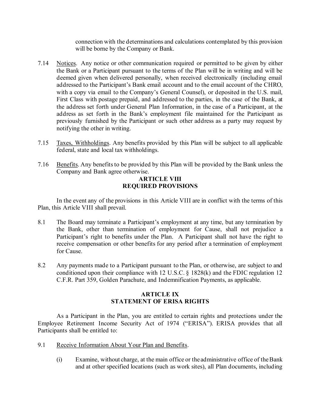 connection with the determinations and calculations contemplated by this provision will be borne by the Company or Bank. 7.14 Notices. Any notice or other communication required or permitted to be given by either the Bank or a Participant pursuant to the terms of the Plan will be in writing and will be deemed given when delivered personally, when received electronically (including email addressed to the Participant’s Bank email account and to the email account of the CHRO, with a copy via email to the Company’s General Counsel), or deposited in the U.S. mail, First Class with postage prepaid, and addressed to the parties, in the case of the Bank, at the address set forth under General Plan Information, in the case of a Participant, at the address as set forth in the Bank’s employment file maintained for the Participant as previously furnished by the Participant or such other address as a party may request by notifying the other in writing. 7.15 Taxes, Withholdings. Any benefits provided by this Plan will be subject to all applicable federal, state and local tax withholdings. 7.16 Benefits. Any benefits to be provided by this Plan will be provided by the Bank unless the Company and Bank agree otherwise. ARTICLE VIII REQUIRED PROVISIONS In the event any of the provisions in this Article VIII are in conflict with the terms of this Plan, this Article VIII shall prevail. 8.1 The Board may terminate a Participant’s employment at any time, but any termination by the Bank, other than termination of employment for Cause, shall not prejudice a Participant’s right to benefits under the Plan. A Participant shall not have the right to receive compensation or other benefits for any period after a termination of employment for Cause. 8.2 Any payments made to a Participant pursuant to the Plan, or otherwise, are subject to and conditioned upon their compliance with 12 U.S.C. § 1828(k) and the FDIC regulation 12 C.F.R. Part 359, Golden Parachute, and Indemnification Payments, as applicable. ARTICLE IX STATEMENT OF ERISA RIGHTS As a Participant in the Plan, you are entitled to certain rights and protections under the Employee Retirement Income Security Act of 1974 (“ERISA”). ERISA provides that all Participants shall be entitled to: 9.1 Receive Information About Your Plan and Benefits. (i) Examine, without charge, at the main office or the administrative office of the Bank and at other specified locations (such as work sites), all Plan documents, including