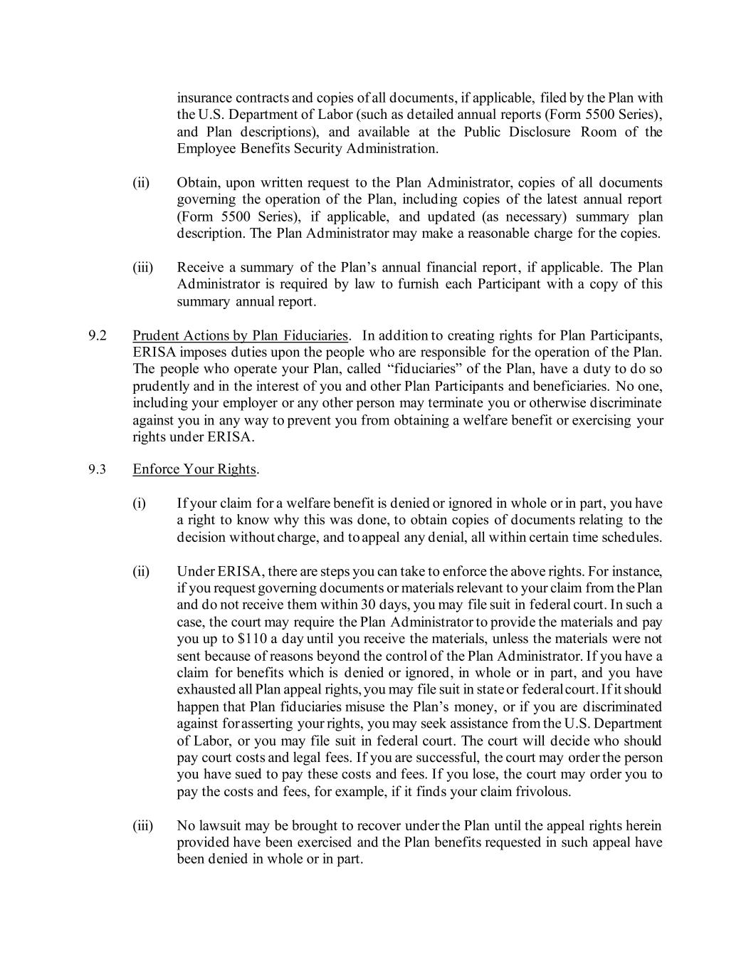 insurance contracts and copies of all documents, if applicable, filed by the Plan with the U.S. Department of Labor (such as detailed annual reports (Form 5500 Series), and Plan descriptions), and available at the Public Disclosure Room of the Employee Benefits Security Administration. (ii) Obtain, upon written request to the Plan Administrator, copies of all documents governing the operation of the Plan, including copies of the latest annual report (Form 5500 Series), if applicable, and updated (as necessary) summary plan description. The Plan Administrator may make a reasonable charge for the copies. (iii) Receive a summary of the Plan’s annual financial report , if applicable. The Plan Administrator is required by law to furnish each Participant with a copy of this summary annual report. 9.2 Prudent Actions by Plan Fiduciaries. In addition to creating rights for Plan Participants, ERISA imposes duties upon the people who are responsible for the operation of the Plan. The people who operate your Plan, called “fiduciaries” of the Plan, have a duty to do so prudently and in the interest of you and other Plan Participants and beneficiaries. No one, including your employer or any other person may terminate you or otherwise discriminate against you in any way to prevent you from obtaining a welfare benefit or exercising your rights under ERISA. 9.3 Enforce Your Rights. (i) If your claim for a welfare benefit is denied or ignored in whole or in part, you have a right to know why this was done, to obtain copies of documents relating to the decision without charge, and to appeal any denial, all within certain time schedules. (ii) Under ERISA, there are steps you can take to enforce the above rights. For instance, if you request governing documents or materials relevant to your claim from the Plan and do not receive them within 30 days, you may file suit in federal court. In such a case, the court may require the Plan Administrator to provide the materials and pay you up to $110 a day until you receive the materials, unless the materials were not sent because of reasons beyond the control of the Plan Administrator. If you have a claim for benefits which is denied or ignored, in whole or in part, and you have exhausted all Plan appeal rights, you may file suit in state or federal court. If it should happen that Plan fiduciaries misuse the Plan’s money, or if you are discriminated against for asserting your rights, you may seek assistance from the U.S. Department of Labor, or you may file suit in federal court. The court will decide who should pay court costs and legal fees. If you are successful, the court may order the person you have sued to pay these costs and fees. If you lose, the court may order you to pay the costs and fees, for example, if it finds your claim frivolous. (iii) No lawsuit may be brought to recover under the Plan until the appeal rights herein provided have been exercised and the Plan benefits requested in such appeal have been denied in whole or in part.