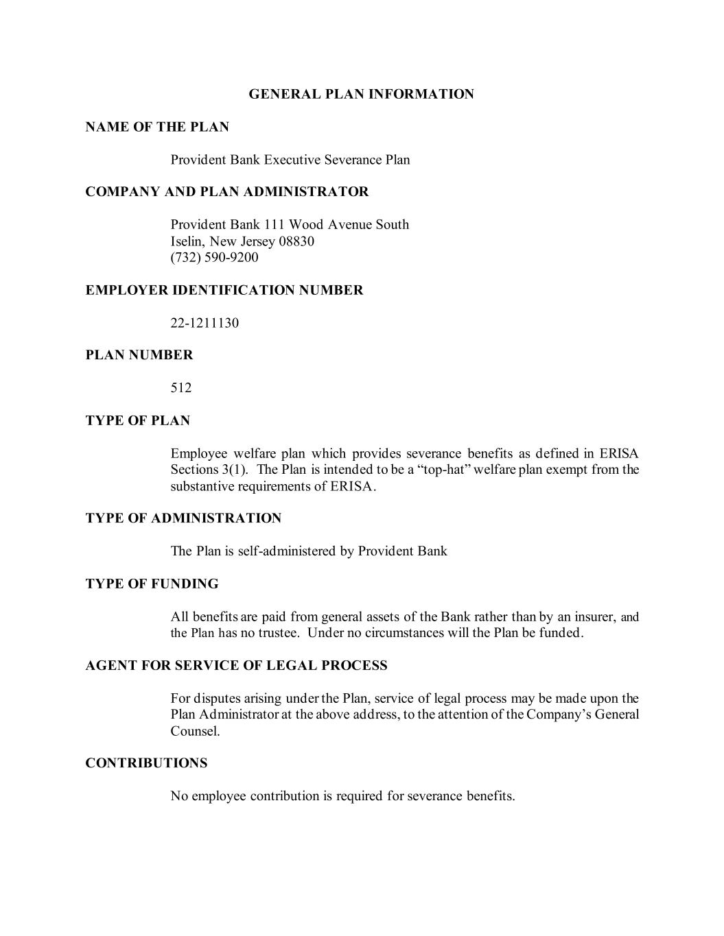GENERAL PLAN INFORMATION NAME OF THE PLAN Provident Bank Executive Severance Plan COMPANY AND PLAN ADMINISTRATOR Provident Bank 111 Wood Avenue South Iselin, New Jersey 08830 (732) 590-9200 EMPLOYER IDENTIFICATION NUMBER 22-1211130 PLAN NUMBER 512 TYPE OF PLAN Employee welfare plan which provides severance benefits as defined in ERISA Sections 3(1). The Plan is intended to be a “top-hat” welfare plan exempt from the substantive requirements of ERISA. TYPE OF ADMINISTRATION The Plan is self-administered by Provident Bank TYPE OF FUNDING All benefits are paid from general assets of the Bank rather than by an insurer, and the Plan has no trustee. Under no circumstances will the Plan be funded. AGENT FOR SERVICE OF LEGAL PROCESS For disputes arising under the Plan, service of legal process may be made upon the Plan Administrator at the above address, to the attention of the Company’s General Counsel. CONTRIBUTIONS No employee contribution is required for severance benefits.
