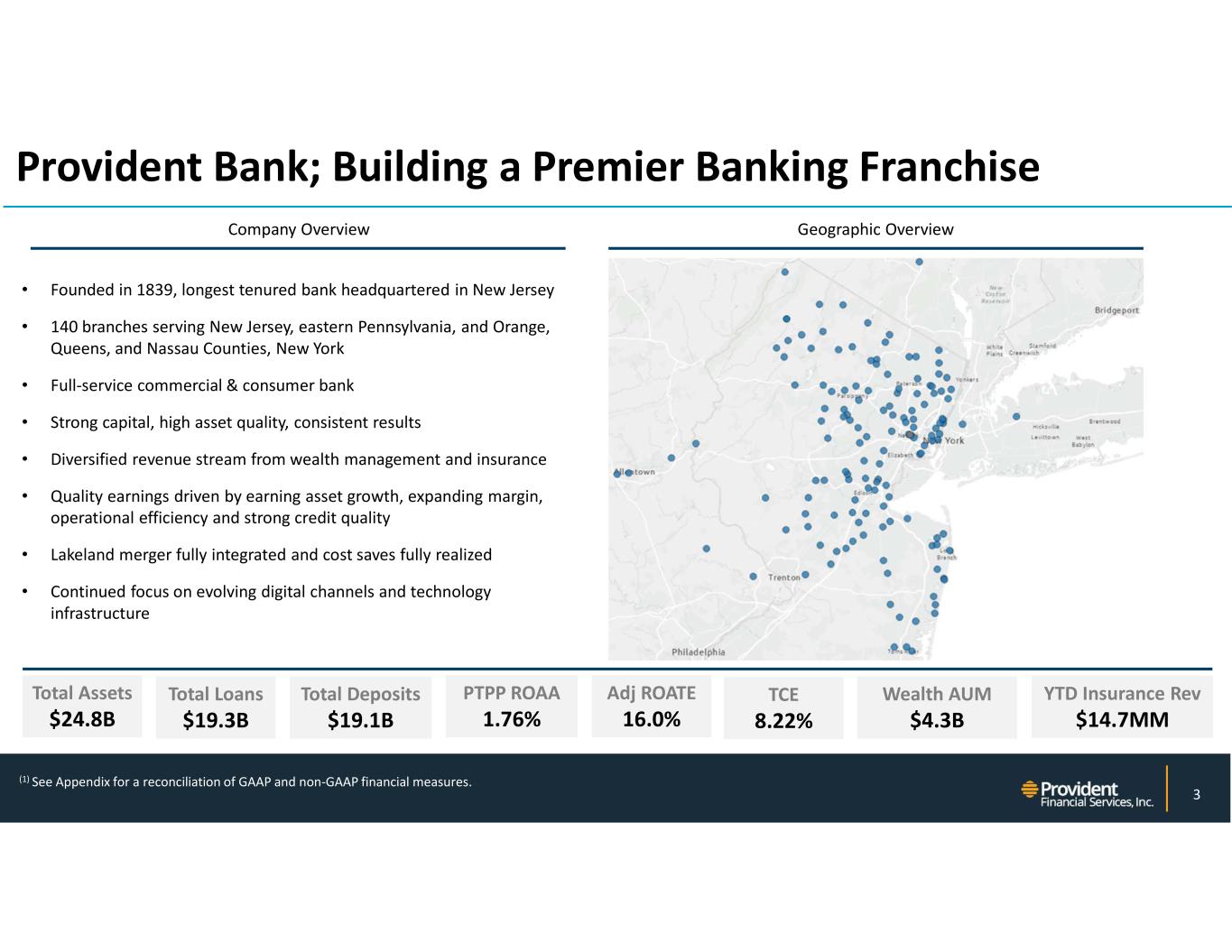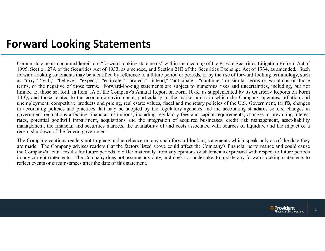 NYSE: PFS Forward Looking Statements Certain statements contained herein are “forward-looking statements” within the meaning of the Private Securities Litigation Reform Act of 1995, Section 27A of the Securities Act of 1933, as amended, and Section 21E of the Securities Exchange Act of 1934, as amended. Such forward-looking statements may be identified by reference to a future period or periods, or by the use of forward-looking terminology, such as “may,” “will,” “believe,” “expect,” “estimate,” "project," "intend," “anticipate,” “continue,” or similar terms or variations on those terms, or the negative of those terms. Forward-looking statements are subject to numerous risks and uncertainties, including, but not limited to, those set forth in Item 1A of the Company's Annual Report on Form 10-K, as supplemented by its Quarterly Reports on Form 10-Q, and those related to the economic environment, particularly in the market areas in which the Company operates, inflation and unemployment, competitive products and pricing, real estate values, fiscal and monetary policies of the U.S. Government, tariffs, changes in accounting policies and practices that may be adopted by the regulatory agencies and the accounting standards setters, changes in government regulations affecting financial institutions, including regulatory fees and capital requirements, changes in prevailing interest rates, potential goodwill impairment, acquisitions and the integration of acquired businesses, credit risk management, asset-liability management, the financial and securities markets, the availability of and costs associated with sources of liquidity, and the impact of a recent shutdown of the federal government. The Company cautions readers not to place undue reliance on any such forward-looking statements which speak only as of the date they are made. The Company advises readers that the factors listed above could affect the Company's financial performance and could cause the Company's actual results for future periods to differ materially from any opinions or statements expressed with respect to future periods in any current statements. The Company does not assume any duty, and does not undertake, to update any forward-looking statements to reflect events or circumstances after the date of this statement. 2