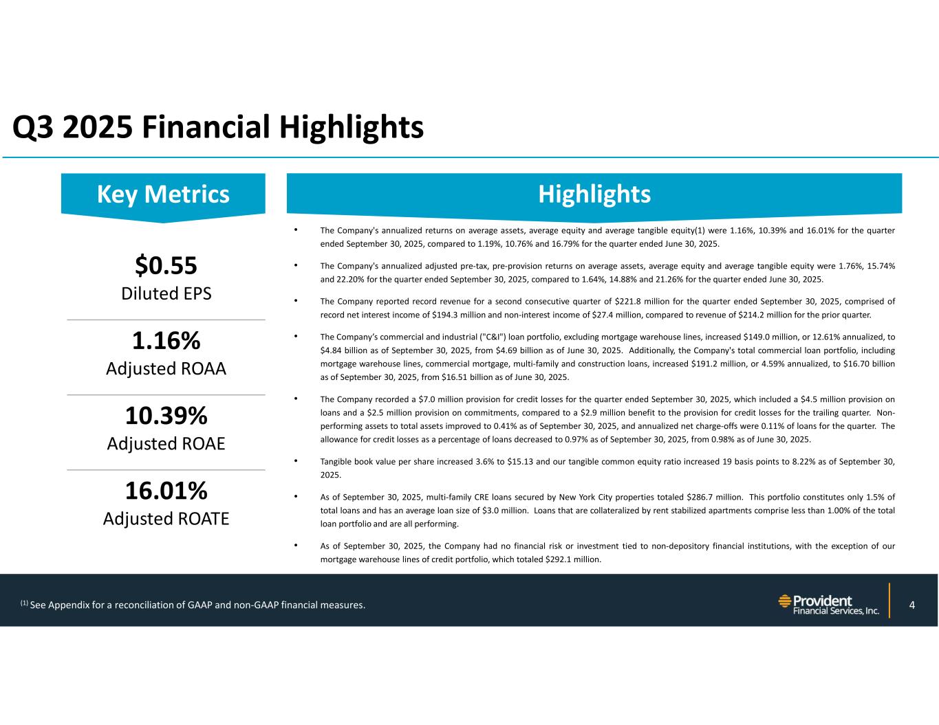 NYSE: PFS 4 Q3 2025 Financial Highlights $0.55 Diluted EPS 1.16% Adjusted ROAA 10.39% Adjusted ROAE 16.01% Adjusted ROATE Key Metrics Highlights • The Company's annualized returns on average assets, average equity and average tangible equity(1) were 1.16%, 10.39% and 16.01% for the quarter ended September 30, 2025, compared to 1.19%, 10.76% and 16.79% for the quarter ended June 30, 2025. • The Company's annualized adjusted pre-tax, pre-provision returns on average assets, average equity and average tangible equity were 1.76%, 15.74% and 22.20% for the quarter ended September 30, 2025, compared to 1.64%, 14.88% and 21.26% for the quarter ended June 30, 2025. • The Company reported record revenue for a second consecutive quarter of $221.8 million for the quarter ended September 30, 2025, comprised of record net interest income of $194.3 million and non-interest income of $27.4 million, compared to revenue of $214.2 million for the prior quarter. • The Company’s commercial and industrial ("C&I") loan portfolio, excluding mortgage warehouse lines, increased $149.0 million, or 12.61% annualized, to $4.84 billion as of September 30, 2025, from $4.69 billion as of June 30, 2025. Additionally, the Company's total commercial loan portfolio, including mortgage warehouse lines, commercial mortgage, multi-family and construction loans, increased $191.2 million, or 4.59% annualized, to $16.70 billion as of September 30, 2025, from $16.51 billion as of June 30, 2025. • The Company recorded a $7.0 million provision for credit losses for the quarter ended September 30, 2025, which included a $4.5 million provision on loans and a $2.5 million provision on commitments, compared to a $2.9 million benefit to the provision for credit losses for the trailing quarter. Non- performing assets to total assets improved to 0.41% as of September 30, 2025, and annualized net charge-offs were 0.11% of loans for the quarter. The allowance for credit losses as a percentage of loans decreased to 0.97% as of September 30, 2025, from 0.98% as of June 30, 2025. • Tangible book value per share increased 3.6% to $15.13 and our tangible common equity ratio increased 19 basis points to 8.22% as of September 30, 2025. • As of September 30, 2025, multi-family CRE loans secured by New York City properties totaled $286.7 million. This portfolio constitutes only 1.5% of total loans and has an average loan size of $3.0 million. Loans that are collateralized by rent stabilized apartments comprise less than 1.00% of the total loan portfolio and are all performing. • As of September 30, 2025, the Company had no financial risk or investment tied to non-depository financial institutions, with the exception of our mortgage warehouse lines of credit portfolio, which totaled $292.1 million. (1) See Appendix for a reconciliation of GAAP and non-GAAP financial measures.