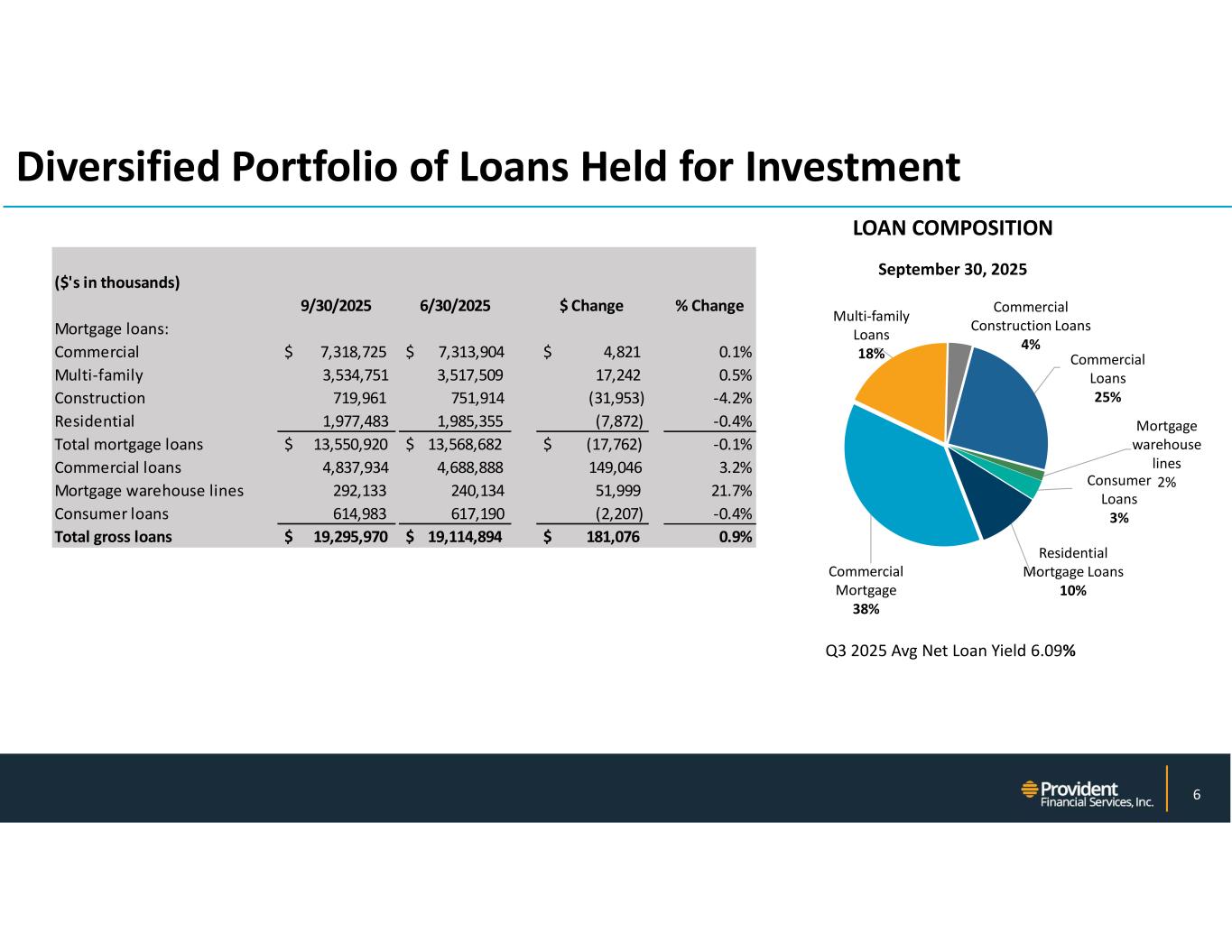 NYSE: PFS Stable Core Funding Base DEPOSIT COMPOSITION 5 Non-interest bearing deposits 19.5% Interest bearing core deposits 42.0% Municipal deposits 19.6% Certificates of deposit 14.2% Wholesale deposits 4.8% September 30, 2025 Q3 Cost of Interest-Bearing Deposits 2.67% Q3 Total Cost of Deposits 2.14% % Change$ Change 6/30/20259/30/2025 ($'s in thousands) 0.1%$ 3,863$ 3,716,096 $ 3,719,959 Non-interest bearing deposits 0.8%65,8157,946,878 8,012,693 Interest bearing core deposits 7.4%258,3123,484,183 3,742,494 Municipal deposits 0.3%7,0802,706,670 2,713,750 Certificates of deposit 6.2%52,650854,698 907,347 Wholesale deposits* 2.1%$ 387,719$ 18,708,524 $ 19,096,243 Total *Includes Brokered Deposits and Swap Collateral