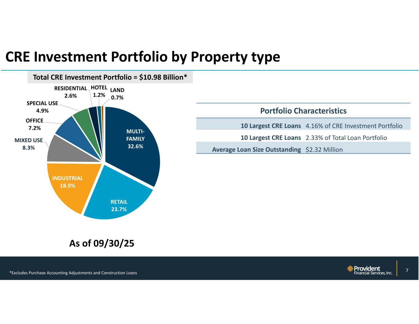 NYSE: PFS Diversified Portfolio of Loans Held for Investment September 30, 2025 6 Residential Mortgage Loans 10% Commercial Mortgage 38% Multi-family Loans 18% Commercial Construction Loans 4% Commercial Loans 25% Mortgage warehouse lines 2%Consumer Loans 3% LOAN COMPOSITION Q3 2025 Avg Net Loan Yield 6.09% ($'s in thousands) 9/30/2025 6/30/2025 $ Change % Change Mortgage loans: Commercial $ 7,318,725 $ 7,313,904 $ 4,821 0.1% Multi-family 3,534,751 3,517,509 17,242 0.5% Construction 719,961 751,914 (31,953) -4.2% Residential 1,977,483 1,985,355 (7,872) -0.4% Total mortgage loans $ 13,550,920 $ 13,568,682 $ (17,762) -0.1% Commercial loans 4,837,934 4,688,888 149,046 3.2% Mortgage warehouse lines 292,133 240,134 51,999 21.7% Consumer loans 614,983 617,190 (2,207) -0.4% Total gross loans $ 19,295,970 $ 19,114,894 $ 181,076 0.9%