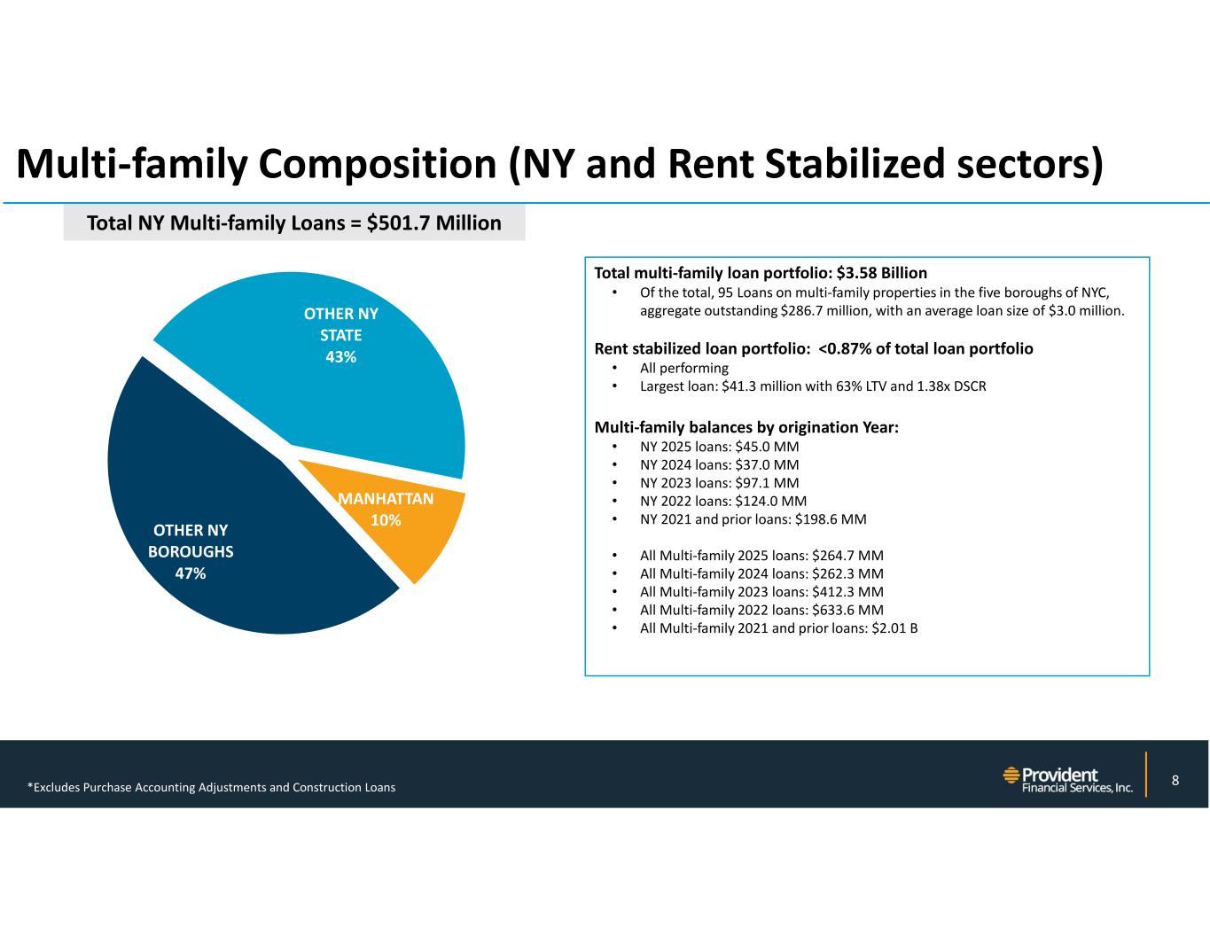 NYSE: PFS CRE Investment Portfolio by Property type 7 As of 09/30/25 MULTI- FAMILY 32.6% RETAIL 23.7% INDUSTRIAL 18.9% MIXED USE 8.3% OFFICE 7.2% SPECIAL USE 4.9% RESIDENTIAL 2.6% HOTEL 1.2% LAND 0.7% Portfolio Characteristics 4.16% of CRE Investment Portfolio10 Largest CRE Loans 2.33% of Total Loan Portfolio10 Largest CRE Loans $2.32 MillionAverage Loan Size Outstanding Total CRE Investment Portfolio = $10.98 Billion* *Excludes Purchase Accounting Adjustments and Construction Loans