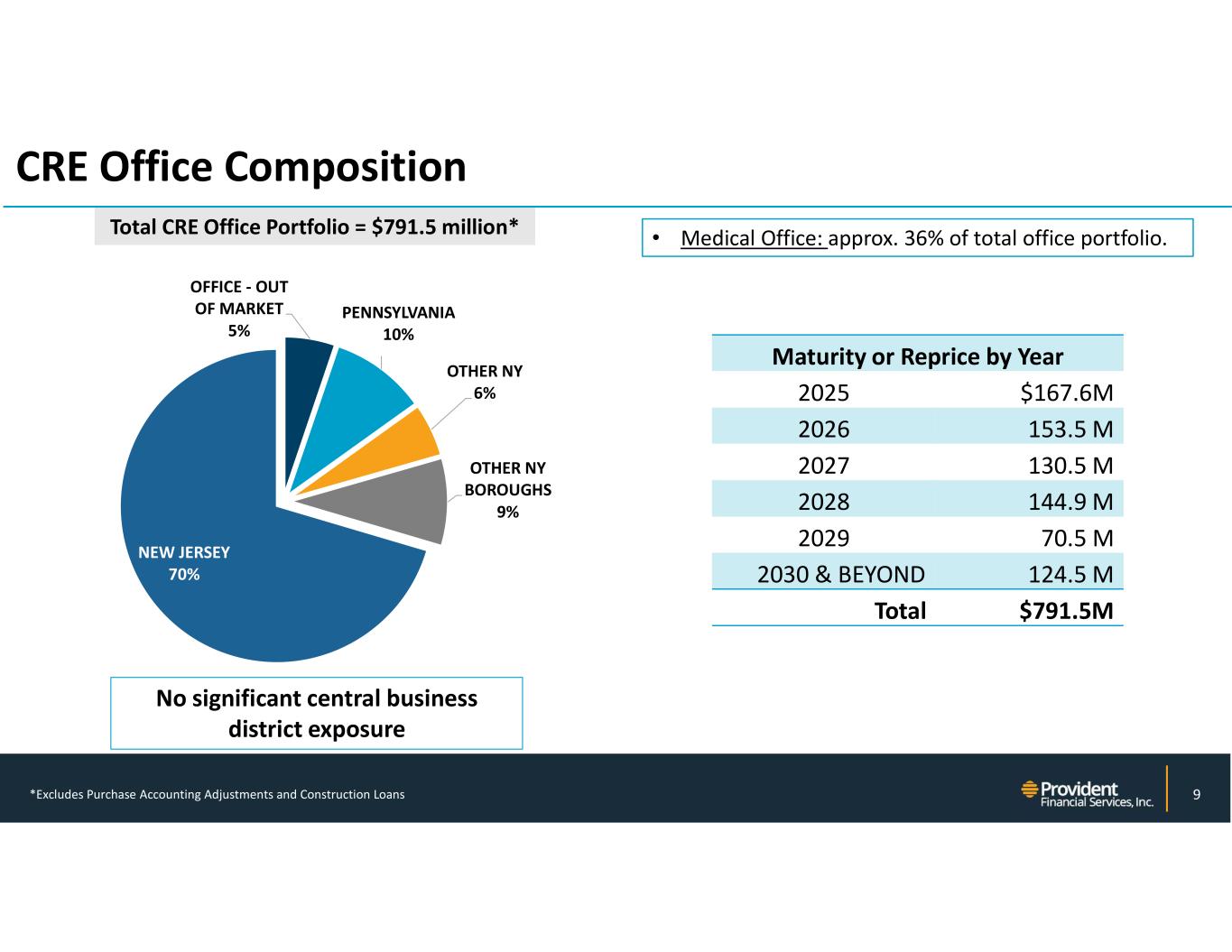 NYSE: PFS Multi-family Composition (NY and Rent Stabilized sectors) 8 OTHER NY BOROUGHS 47% OTHER NY STATE 43% MANHATTAN 10% Total NY Multi-family Loans = $501.7 Million Total multi-family loan portfolio: $3.58 Billion • Of the total, 95 Loans on multi-family properties in the five boroughs of NYC, aggregate outstanding $286.7 million, with an average loan size of $3.0 million. Rent stabilized loan portfolio: <0.87% of total loan portfolio • All performing • Largest loan: $41.3 million with 63% LTV and 1.38x DSCR Multi-family balances by origination Year: • NY 2025 loans: $45.0 MM • NY 2024 loans: $37.0 MM • NY 2023 loans: $97.1 MM • NY 2022 loans: $124.0 MM • NY 2021 and prior loans: $198.6 MM • All Multi-family 2025 loans: $264.7 MM • All Multi-family 2024 loans: $262.3 MM • All Multi-family 2023 loans: $412.3 MM • All Multi-family 2022 loans: $633.6 MM • All Multi-family 2021 and prior loans: $2.01 B *Excludes Purchase Accounting Adjustments and Construction Loans