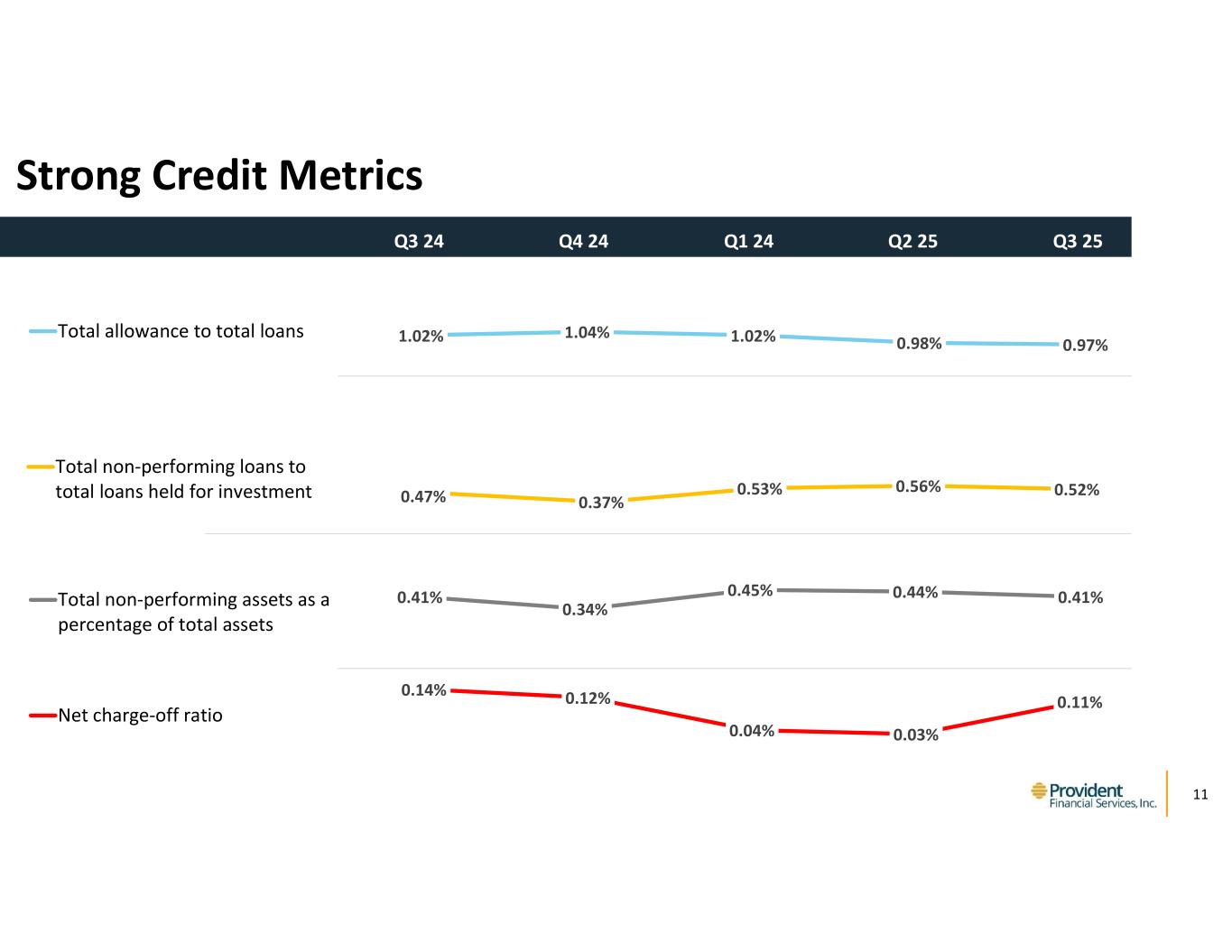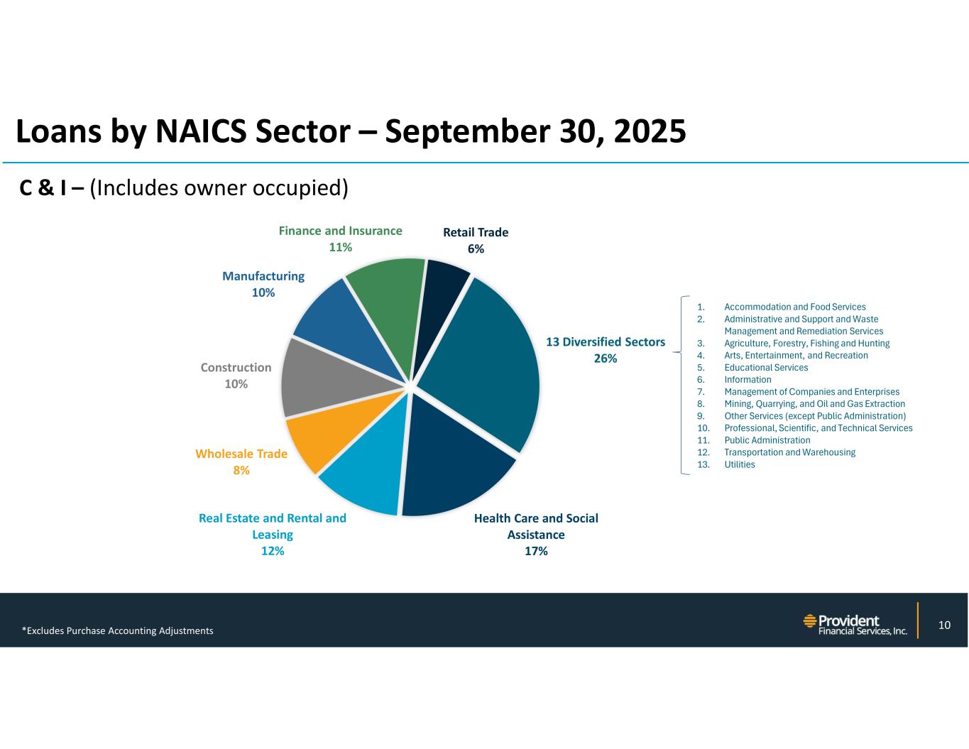 NYSE: PFS C & I – (Includes owner occupied) Loans by NAICS Sector – September 30, 2025 10 Health Care and Social Assistance 17% Real Estate and Rental and Leasing 12% Wholesale Trade 8% Construction 10% Manufacturing 10% Finance and Insurance 11% Retail Trade 6% 13 Diversified Sectors 26% 1. Accommodation and Food Services 2. Administrative and Support and Waste Management and Remediation Services 3. Agriculture, Forestry, Fishing and Hunting 4. Arts, Entertainment, and Recreation 5. Educational Services 6. Information 7. Management of Companies and Enterprises 8. Mining, Quarrying, and Oil and Gas Extraction 9. Other Services (except Public Administration) 10. Professional, Scientific, and Technical Services 11. Public Administration 12. Transportation and Warehousing 13. Utilities *Excludes Purchase Accounting Adjustments