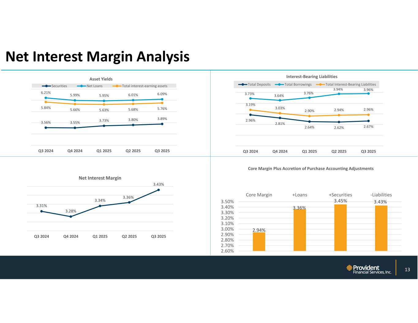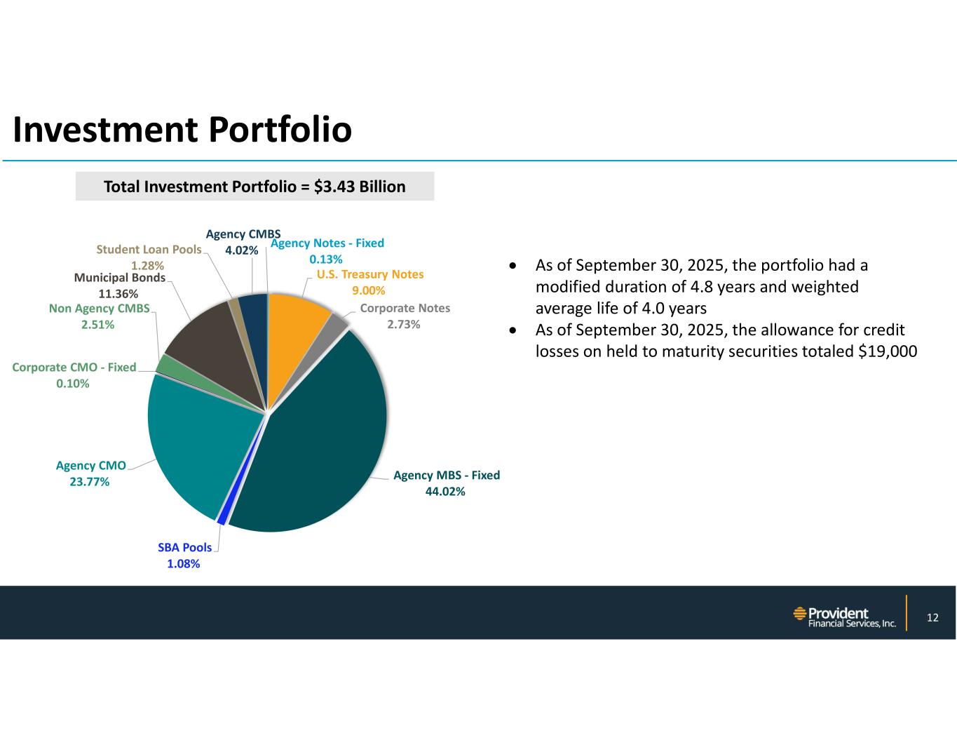 NYSE: PFS Agency Notes - Fixed 0.13% U.S. Treasury Notes 9.00% Corporate Notes 2.73% Agency MBS - Fixed 44.02% SBA Pools 1.08% Agency CMO 23.77% Corporate CMO - Fixed 0.10% Non Agency CMBS 2.51% Municipal Bonds 11.36% Student Loan Pools 1.28% Agency CMBS 4.02% Investment Portfolio 12 Total Investment Portfolio = $3.43 Billion  As of September 30, 2025, the portfolio had a modified duration of 4.8 years and weighted average life of 4.0 years  As of September 30, 2025, the allowance for credit losses on held to maturity securities totaled $19,000