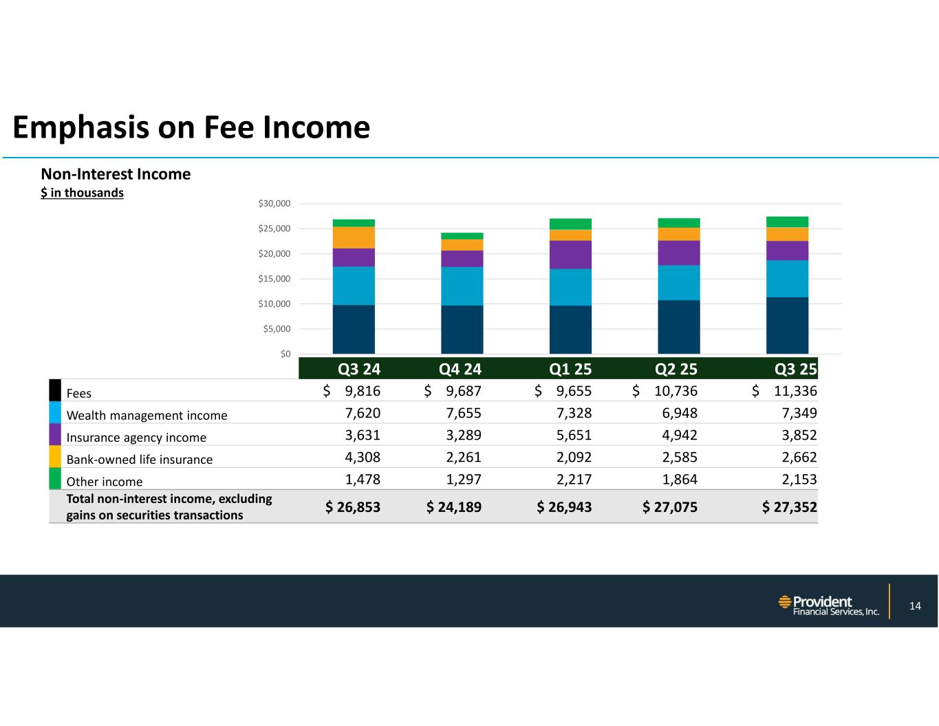 NYSE: PFS Net Interest Margin Analysis 13 3.56% 3.55% 3.73% 3.80% 3.89% 6.21% 5.99% 5.95% 6.01% 6.09% 5.84% 5.66% 5.63% 5.68% 5.76% Q3 2024 Q4 2024 Q1 2025 Q2 2025 Q3 2025 Asset Yields Securities Net Loans Total interest-earning assets 2.96% 2.81% 2.64% 2.62% 2.67% 3.73% 3.64% 3.76% 3.94% 3.96% 3.19% 3.03% 2.90% 2.94% 2.96% Q3 2024 Q4 2024 Q1 2025 Q2 2025 Q3 2025 Interest-Bearing Liabilities Total Deposits Total Borrowings Total Interest-Bearing Liabilities 3.31% 3.28% 3.34% 3.36% 3.43% Q3 2024 Q4 2024 Q1 2025 Q2 2025 Q3 2025 Net Interest Margin 2.94% 3.36% 3.45% 3.43% 2.60% 2.70% 2.80% 2.90% 3.00% 3.10% 3.20% 3.30% 3.40% 3.50% Core Margin +Loans +Securities -Liabilities Core Margin Plus Accretion of Purchase Accounting Adjustments