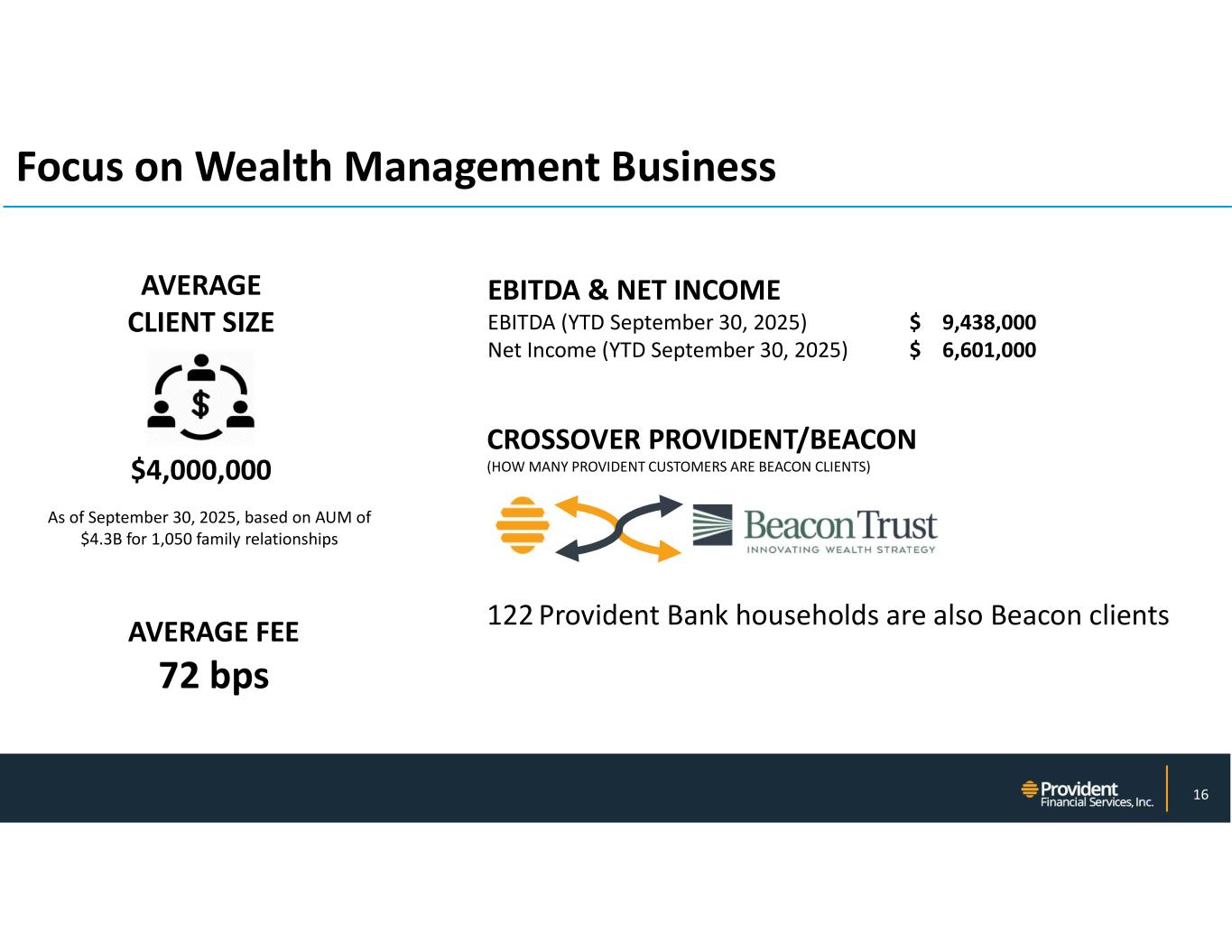 NYSE: PFS * Represents interest on lines of credit to Beacon clients, whose investment accounts are pledged as collateral. Advisory 87% Trust & Estate 8% Tax 2% Private Banking 3% Focus on Wealth Management Business 15 $4.3 Billion AUM For 1,050 family relationships 2025 YTD Revenue $ 19,351,757 Advisory $ 1,726,805 Trust & Estate $ 545,845 Tax *$ 572,667 Interest Income $ 22,197,074 Total