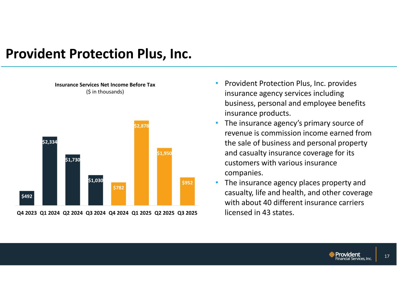 NYSE: PFS • Provident Protection Plus, Inc. provides insurance agency services including business, personal and employee benefits insurance products. • The insurance agency’s primary source of revenue is commission income earned from the sale of business and personal property and casualty insurance coverage for its customers with various insurance companies. • The insurance agency places property and casualty, life and health, and other coverage with about 40 different insurance carriers licensed in 43 states. Provident Protection Plus, Inc. 17 $492 $2,334 $1,730 $1,030 $782 $2,878 $1,950 $952 Q4 2023 Q1 2024 Q2 2024 Q3 2024 Q4 2024 Q1 2025 Q2 2025 Q3 2025 Insurance Services Net Income Before Tax ($ in thousands)