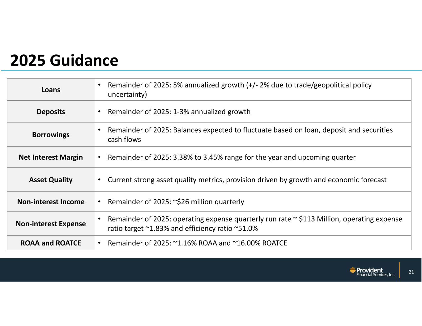 NYSE: PFS 2025 Guidance 21 • Remainder of 2025: 5% annualized growth (+/- 2% due to trade/geopolitical policy uncertainty) Loans • Remainder of 2025: 1-3% annualized growthDeposits • Remainder of 2025: Balances expected to fluctuate based on loan, deposit and securities cash flowsBorrowings • Remainder of 2025: 3.38% to 3.45% range for the year and upcoming quarterNet Interest Margin • Current strong asset quality metrics, provision driven by growth and economic forecastAsset Quality • Remainder of 2025: ~$26 million quarterlyNon-interest Income • Remainder of 2025: operating expense quarterly run rate ~ $113 Million, operating expense ratio target ~1.83% and efficiency ratio ~51.0%Non-interest Expense • Remainder of 2025: ~1.16% ROAA and ~16.00% ROATCEROAA and ROATCE