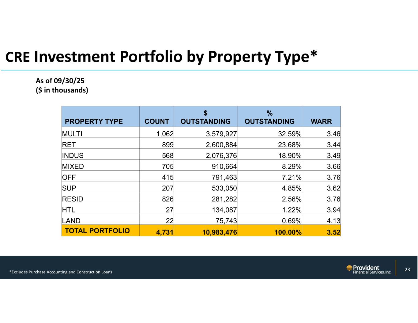 NYSE: PFS As of 09/30/25 ($ in thousands) CRE Investment Portfolio by Property Type* 23*Excludes Purchase Accounting and Construction Loans WARR % OUTSTANDING $ OUTSTANDINGCOUNT PROPERTY TYPE 3.4632.59%3,579,927 1,062MULTI 3.4423.68%2,600,884 899RET 3.4918.90%2,076,376 568INDUS 3.668.29%910,664 705MIXED 3.767.21%791,463 415OFF 3.624.85%533,050 207SUP 3.762.56%281,282 826RESID 3.941.22%134,087 27HTL 4.130.69%75,743 22LAND 3.52100.00%10,983,476 4,731TOTAL PORTFOLIO