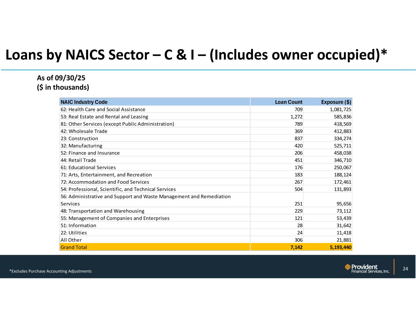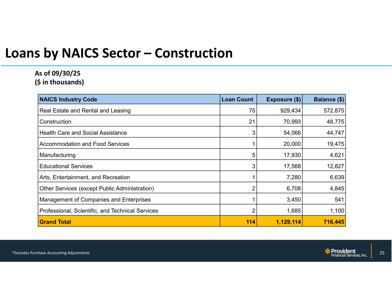 NYSE: PFS Loans by NAICS Sector – Construction 25*Excludes Purchase Accounting Adjustments Balance ($)Exposure ($)Loan CountNAICS Industry Code 572,875929,43475Real Estate and Rental and Leasing 48,77570,99321Construction 44,74754,0663Health Care and Social Assistance 19,47520,0001Accommodation and Food Services 4,62117,9305Manufacturing 12,82717,5683Educational Services 6,6397,2801Arts, Entertainment, and Recreation 4,8456,7082Other Services (except Public Administration) 5413,4501Management of Companies and Enterprises 1,1001,6852Professional, Scientific, and Technical Services 716,4451,129,114114Grand Total As of 09/30/25 ($ in thousands)