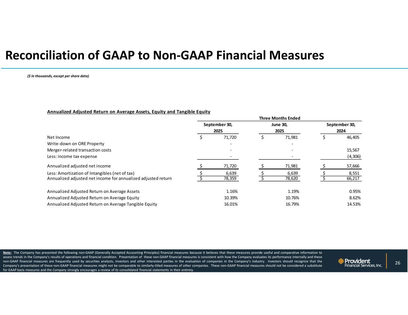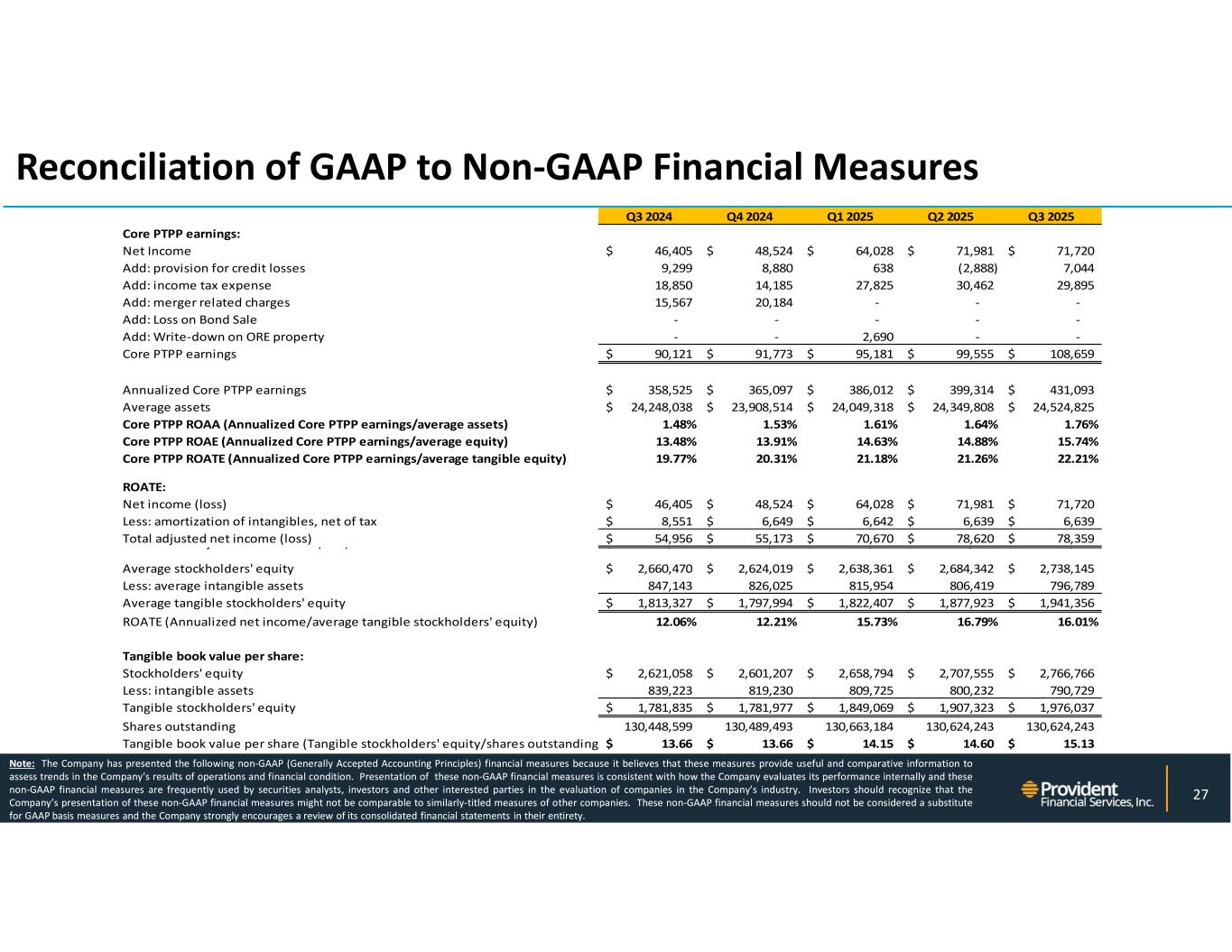 NYSE: PFS Note: The Company has presented the following non-GAAP (Generally Accepted Accounting Principles) financial measures because it believes that these measures provide useful and comparative information to assess trends in the Company’s results of operations and financial condition. Presentation of these non-GAAP financial measures is consistent with how the Company evaluates its performance internally and these non-GAAP financial measures are frequently used by securities analysts, investors and other interested parties in the evaluation of companies in the Company’s industry. Investors should recognize that the Company’s presentation of these non-GAAP financial measures might not be comparable to similarly-titled measures of other companies. These non-GAAP financial measures should not be considered a substitute for GAAP basis measures and the Company strongly encourages a review of its consolidated financial statements in their entirety. ($ in thousands, except per share data) Reconciliation of GAAP to Non-GAAP Financial Measures 26 Annualized Adjusted Return on Average Assets, Equity and Tangible Equity September 30, June 30, September 30, 2025 2025 2024 Net Income 71,720$ 71,981$ 46,405$ Write-down on ORE Property - - Merger-related transaction costs - - 15,567 Less: income tax expense - - (4,306) Annualized adjusted net income 71,720$ 71,981$ 57,666$ Less: Amortization of Intangibles (net of tax) 6,639$ 6,639$ 8,551$ Annualized adjusted net income for annualized adjusted return 78,359$ 78,620$ 66,217$ Annualized Adjusted Return on Average Assets 1.16% 1.19% 0.95% Annualized Adjusted Return on Average Equity 10.39% 10.76% 8.62% Annualized Adjusted Return on Average Tangible Equity 16.01% 16.79% 14.53% Three Months Ended