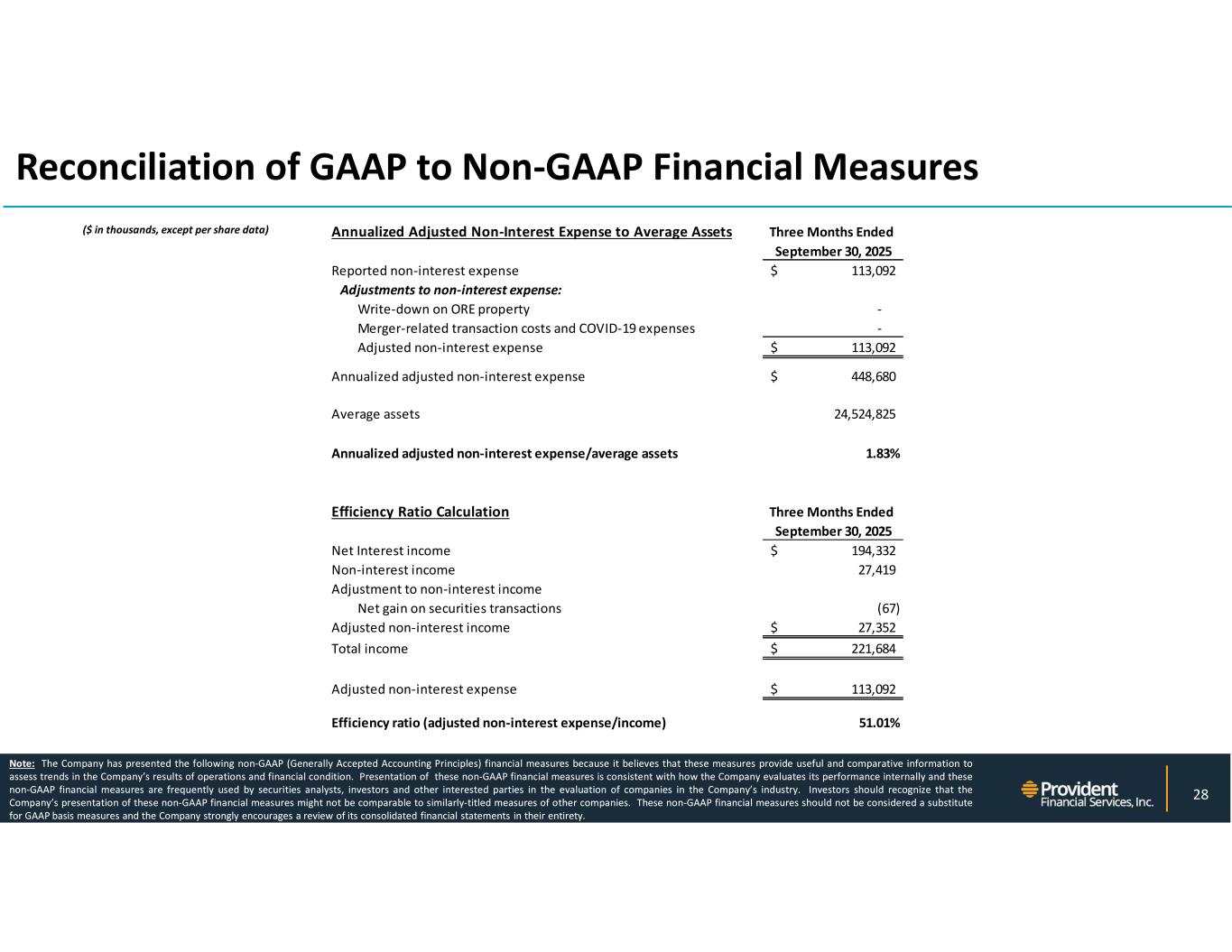NYSE: PFS Note: The Company has presented the following non-GAAP (Generally Accepted Accounting Principles) financial measures because it believes that these measures provide useful and comparative information to assess trends in the Company’s results of operations and financial condition. Presentation of these non-GAAP financial measures is consistent with how the Company evaluates its performance internally and these non-GAAP financial measures are frequently used by securities analysts, investors and other interested parties in the evaluation of companies in the Company’s industry. Investors should recognize that the Company’s presentation of these non-GAAP financial measures might not be comparable to similarly-titled measures of other companies. These non-GAAP financial measures should not be considered a substitute for GAAP basis measures and the Company strongly encourages a review of its consolidated financial statements in their entirety. Reconciliation of GAAP to Non-GAAP Financial Measures 27 Q3 2024 Q4 2024 Q1 2025 Q2 2025 Q3 2025 Core PTPP earnings: Net Income 46,405$ 48,524$ 64,028$ 71,981$ 71,720$ Add: provision for credit losses 9,299 8,880 638 (2,888) 7,044 Add: income tax expense 18,850 14,185 27,825 30,462 29,895 Add: merger related charges 15,567 20,184 - - - Add: Loss on Bond Sale - - - - - Add: Write-down on ORE property - - 2,690 - - Core PTPP earnings 90,121$ 91,773$ 95,181$ 99,555$ 108,659$ Annualized Core PTPP earnings 358,525$ 365,097$ 386,012$ 399,314$ 431,093$ Average assets 24,248,038$ 23,908,514$ 24,049,318$ 24,349,808$ 24,524,825$ Core PTPP ROAA (Annualized Core PTPP earnings/average assets) 1.48% 1.53% 1.61% 1.64% 1.76% Core PTPP ROAE (Annualized Core PTPP earnings/average equity) 13.48% 13.91% 14.63% 14.88% 15.74% Core PTPP ROATE (Annualized Core PTPP earnings/average tangible equity) 19.77% 20.31% 21.18% 21.26% 22.21% ROATE: Net income (loss) 46,405$ 48,524$ 64,028$ 71,981$ 71,720$ Less: amortization of intangibles, net of tax 8,551$ 6,649$ 6,642$ 6,639$ 6,639$ Total adjusted net income (loss) 54,956$ 55,173$ 70,670$ 78,620$ 78,359$ Annualized adjusted net income (loss) 218,629$ 219,493$ 286,606$ 318,848$ 317,789$ Average stockholders' equity 2,660,470$ 2,624,019$ 2,638,361$ 2,684,342$ 2,738,145$ Less: average intangible assets 847,143 826,025 815,954 806,419 796,789 Average tangible stockholders' equity 1,813,327$ 1,797,994$ 1,822,407$ 1,877,923$ 1,941,356$ ROATE (Annualized net income/average tangible stockholders' equity) 12.06% 12.21% 15.73% 16.79% 16.01% Tangible book value per share: Stockholders' equity 2,621,058$ 2,601,207$ 2,658,794$ 2,707,555$ 2,766,766$ Less: intangible assets 839,223 819,230 809,725 800,232 790,729 Tangible stockholders' equity 1,781,835$ 1,781,977$ 1,849,069$ 1,907,323$ 1,976,037$ Shares outstanding 130,448,599 130,489,493 130,663,184 130,624,243 130,624,243 Tangible book value per share (Tangible stockholders' equity/shares outstanding) 13.66$ 13.66$ 14.15$ 14.60$ 15.13$