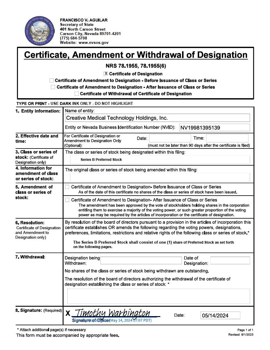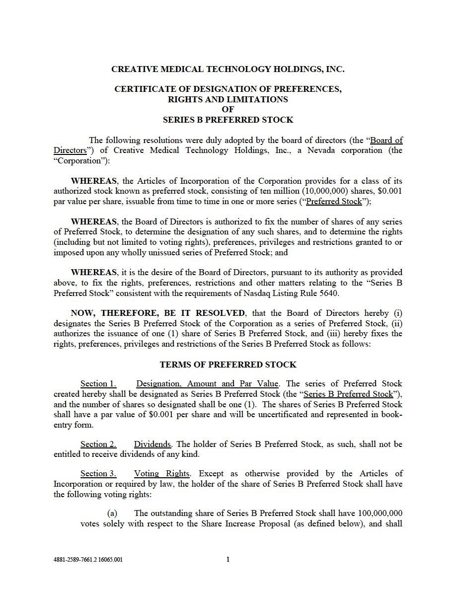 EX-3.1 2 celz_ex31.htm CERTIFICATE OF DESIGNATION celz_ex31.htm