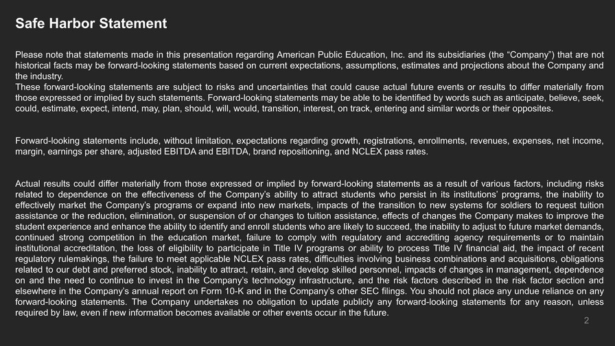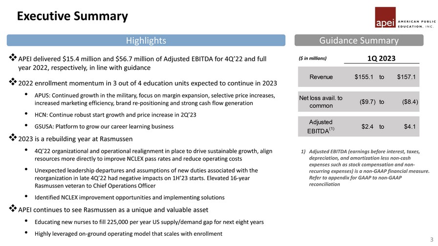 Safe Harbor Statement Please note that statements made in this presentation regarding American Public Education, Inc . and its subsidiaries (the “Company”) that are not historical facts may be forward - looking statements based on current expectations, assumptions, estimates and projections about the Company and the industry . These forward - looking statements are subject to risks and uncertainties that could cause actual future events or results to differ materially from those expressed or implied by such statements . Forward - looking statements may be able to be identified by words such as anticipate, believe, seek, could, estimate, expect, intend, may, plan, should, will, would, transition, interest, on track, entering and similar words or their opposites . Forward - looking statements include, without limitation, expectations regarding growth, registrations, enrollments, revenues, expenses, net income, margin, earnings per share, adjusted EBITDA and EBITDA, brand repositioning, and NCLEX pass rates . Actual results could differ materially from those expressed or implied by forward - looking statements as a result of various factors, including risks related to dependence on the effectiveness of the Company’s ability to attract students who persist in its institutions’ programs, the inability to effectively market the Company’s programs or expand into new markets, impacts of the transition to new systems for soldiers to request tuition assistance or the reduction, elimination, or suspension of or changes to tuition assistance, effects of changes the Company makes to improve the student experience and enhance the ability to identify and enroll students who are likely to succeed, the inability to adjust to future market demands, continued strong competition in the education market, failure to comply with regulatory and accrediting agency requirements or to maintain institutional accreditation, the loss of eligibility to participate in Title IV programs or ability to process Title IV financial aid, the impact of recent regulatory rulemakings, the failure to meet applicable NCLEX pass rates, difficulties involving business combinations and acquisitions, obligations related to our debt and preferred stock, inability to attract, retain, and develop skilled personnel, impacts of changes in management, dependence on and the need to continue to invest in the Company’s technology infrastructure, and the risk factors described in the risk factor section and elsewhere in the Company’s annual report on Form 10 - K and in the Company’s other SEC filings . You should not place any undue reliance on any forward - looking statements . The Company undertakes no obligation to update publicly any forward - looking statements for any reason, unless required by law, even if new information becomes available or other events occur in the future . 2