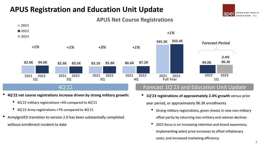 Executive Summary 3 □ APEI delivered $15.4 million and $56.7 million of Adjusted EBITDA for 4Q’22 and full year 2022, respectively, in line with guidance □ 2022 enrollment momentum in 3 out of 4 education units expected to continue in 2023 • APUS: Continued growth in the military, focus on margin expansion, selective price increases, increased marketing efficiency, brand re - positioning and strong cash flow generation • HCN: Continue robust start growth and price increase in 2Q’23 • GSUSA: Platform to grow our career learning business □ 2023 is a rebuilding year at Rasmussen • 4Q’22 organizational and operational realignment in place to drive sustainable growth, align resources more directly to improve NCLEX pass rates and reduce operating costs • Unexpected leadership departures and assumptions of new duties associated with the reorganization in late 4Q’22 had negative impacts on 1H’23 starts. Elevated 16 - year Rasmussen veteran to Chief Operations Officer • Identified NCLEX improvement opportunities and implementing solutions □ APEI continues to see Rasmussen as a unique and valuable asset • Educating new nurses to fill 225,000 per year US supply/demand gap for next eight years • Highly leveraged on - ground operating model that scales with enrollment 1) Adjusted EBITDA (earnings before interest, taxes, depreciation, and amortization less non - cash expenses such as stock compensation and non - recurring expenses) is a non - GAAP financial measure. Refer to appendix for GAAP to non - GAAP reconciliation Highlights Guidance Summary