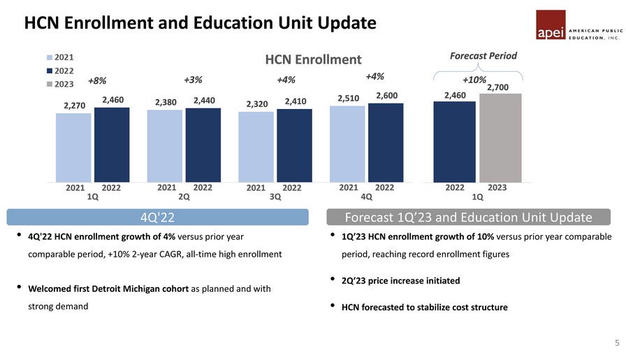 • 1Q’23 registrations of approximately 2.4% growth versus prior year period, or approximately 96.3K enrollments • Strong military registrations, green shoots in new non - military offset partly by returning non - military and veteran declines • 2023 focus is on increasing retention and brand awareness; implementing select price increases to offset inflationary costs; and increased marketing efficiency APUS Registration and Education Unit Update 4Q'22 Forecast 1Q’23 and Education Unit Update 4 • 4Q'22 net course registrations increase driven by strong military growth: • 4Q'22 military registrations +4% compared to 4Q’21 • 4Q'22 Army registrations +7% compared to 4Q’21 • ArmyIgnitED transition to version 2.0 has been substantially completed without enrollment incident to date 92.9K 82.6K 83.1K 86.6K 345.3K 94.0K 83.5K 85.8K 87.2K 350.4K 1Q 2Q 3Q 4Q Full Year APUS Net Course Registrations +1% +1% +3% +1% +1% 2021 2022 2021 2022 2021 2022 2021 2022 2021 2022 94.0K 1Q 2.4% Forecast Period 96.3k 2022 2023
