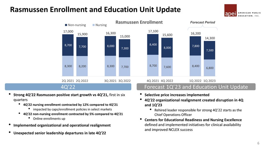 • 4Q'22 HCN enrollment growth of 4% versus prior year comparable period, +10% 2 - year CAGR, all - time high enrollment • Welcomed first Detroit Michigan cohort as planned and with strong demand HCN Enrollment and Education Unit Update 5 4Q'22 Forecast 1Q’23 and Education Unit Update • 1Q’23 HCN enrollment growth of 10% versus prior year comparable period, reaching record enrollment figures • 2Q’23 price increase initiated • HCN forecasted to stabilize cost structure 2,270 2,380 2,320 2,510 2,460 2,440 2,410 2,600 1Q 2Q 3Q 4Q HCN Enrollment +8% +3% +4% +4% 2021 2022 2021 2022 2021 2022 2021 2022 2,460 2,700 1Q +10% Forecast Period 2022 2023