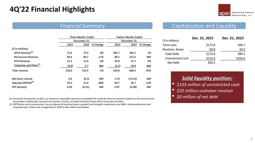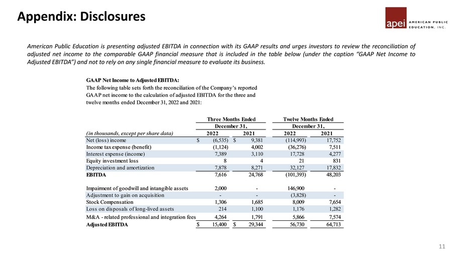 American Public Education is presenting adjusted EBITDA in connection with its GAAP results and urges investors to review the reconciliation of adjusted net income to the comparable GAAP financial measure that is included in the table below (under the caption “GAAP Net Income to Adjusted EBITDA”) and not to rely on any single financial measure to evaluate its business . Appendix: Disclosures 11 GAAP Net Income to Adjusted EBITDA:   (in thousands, except per share data)         Net (loss) income $ (6,535) $ 9,381 (114,993) 17,752 Income tax expense (benefit) (1,124) 4,002 (36,276) 7,511 Interest expense (income) 7,389 3,110 17,728 4,277 Equity investment loss 8 4 21 831 Depreciation and amortization 7,878 8,271 32,127 17,832 EBITDA 7,616 24,768 (101,393) 48,203 Impairment of goodwill and intangible assets 2,000 - 146,900 - Adjustment to gain on acquisition - - (3,828) - Stock Compensation 1,306 1,685 8,009 7,654 Loss on disposals of long-lived assets 214 1,100 1,176 1,282 M&A - related professional and integration fees 4,264 1,791 5,866 7,574 Adjusted EBITDA $ 15,400 $ 29,344 56,730 64,713 Twelve Months Ended December 31, 2022 2021 The following table sets forth the reconciliation of the Company’s reported GAAP net income to the calculation of adjusted EBITDA for the three and twelve months ended December 31, 2022 and 2021: Three Months Ended December 31, 2022 2021
