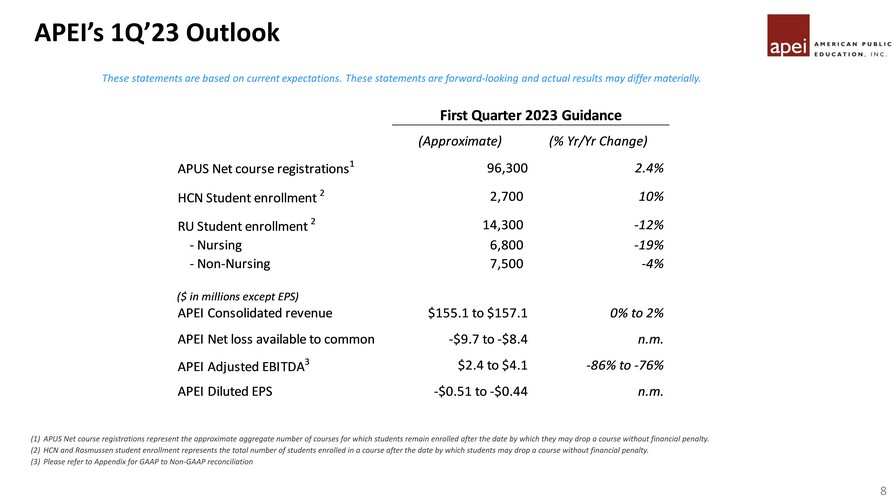 4Q'22 Financial Highlights Financial Summary Capitalization and Liquidity (1) During the third quarter of 2021, we revised our reportable segments and updated the results for the prior period to conform to the current period presentation. Additionally, during the first quarter of 2022, we added Graduate School USA to Corporate and Other. (2) EBITDA plus stock compensation, loss on disposal of long - lived assets, goodwill and intangible impairments and M&A - related prof essional and integration fees. Please refer to Appendix for GAAP to Non - GAAP reconciliation. 7 Solid liquidity position: • $103 million of unrestricted cash • $20 million undrawn revolver • $0 million of net debt Three Months Ended Twelve Months Ended December 31, December 31, 2021 2022 % Change 2021 2022 % Change ($ in millions) APUS Revenue (1) 73.4 73.4 0% 283.7 285.1 1% Rasmussen Revenue 68.4 60.7 -11% 89.5 253.3 NM HCN Revenue 12.3 12.6 3% 45.8 47.1 3% Corporate and Other (1) (0.0) 5.7 NM (0.2) 20.9 NM Total revenue 154.0 152.4 -1% 418.8 606.3 45% Net (loss) income 9.4 (6.5) NM 17.8 (115.0) NM Adjusted EBITDA (2) 29.3 15.4 -48% 64.7 56.7 -12% EPS (diluted) 0.50 (0.35) NM 0.97 (6.08) NM