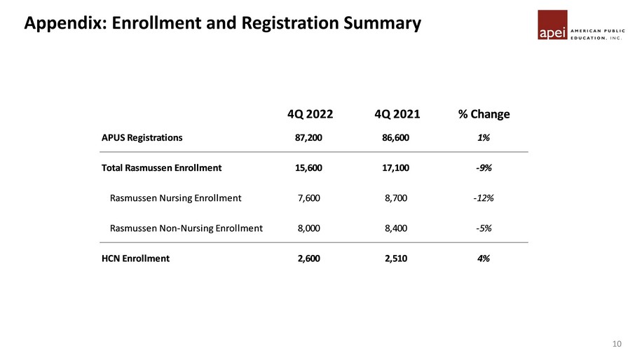These statements are based on current expectations. These statements are forward - looking and actual results may differ materially. (1) APUS Net course registrations represent the approximate aggregate number of courses for which students remain enrolled after the date by which they may drop a course without financial penalty. (2) HCN and Rasmussen student enrollment represents the total number of students enrolled in a course after the date by which stu den ts may drop a course without financial penalty. (3) Please refer to Appendix for GAAP to Non - GAAP reconciliation APEI’s 1Q’23 Outlook 8 First Quarter 2023 Guidance Full Year 2021 Guidance (Approximate) (% Yr/Yr Change) APUS Net course registrations 1 96,300 2.4% HCN Student enrollment 2 2,700 10% RU Student enrollment 2 14,300 -12% - Nursing 6,800 -19% - Non-Nursing 7,500 -4% ($ in millions except EPS) APEI Consolidated revenue $155.1 to $157.1 0% to 2% APEI Net loss available to common -$9.7 to -$8.4 n.m. APEI Adjusted EBITDA 3 $2.4 to $4.1 -86% to -76% APEI Diluted EPS -$0.51 to -$0.44 n.m.