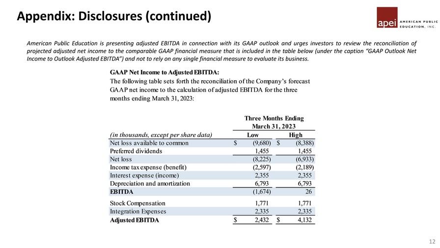 American Public Education is presenting adjusted EBITDA in connection with its GAAP outlook and urges investors to review the reconciliation of projected adjusted net income to the comparable GAAP financial measure that is included in the table below (under the caption “GAAP Outlook Net Income to Outlook Adjusted EBITDA”) and not to rely on any single financial measure to evaluate its business . Appendix: Disclosures (continued) 12 GAAP Net Income to Adjusted EBITDA:   (in thousands, except per share data)     Net loss available to common $ (9,680) $ (8,388) Preferred dividends 1,455 1,455 Net loss (8,225) (6,933) Income tax expense (benefit) (2,597) (2,189) Interest expense (income) 2,355 2,355 Depreciation and amortization 6,793 6,793 EBITDA (1,674) 26 Stock Compensation 1,771 1,771 Integration Expenses 2,335 2,335 Adjusted EBITDA $ 2,432 $ 4,132 March 31, 2023 Low High The following table sets forth the reconciliation of the Company’s forecast GAAP net income to the calculation of adjusted EBITDA for the three months ending March 31, 2023: Three Months Ending