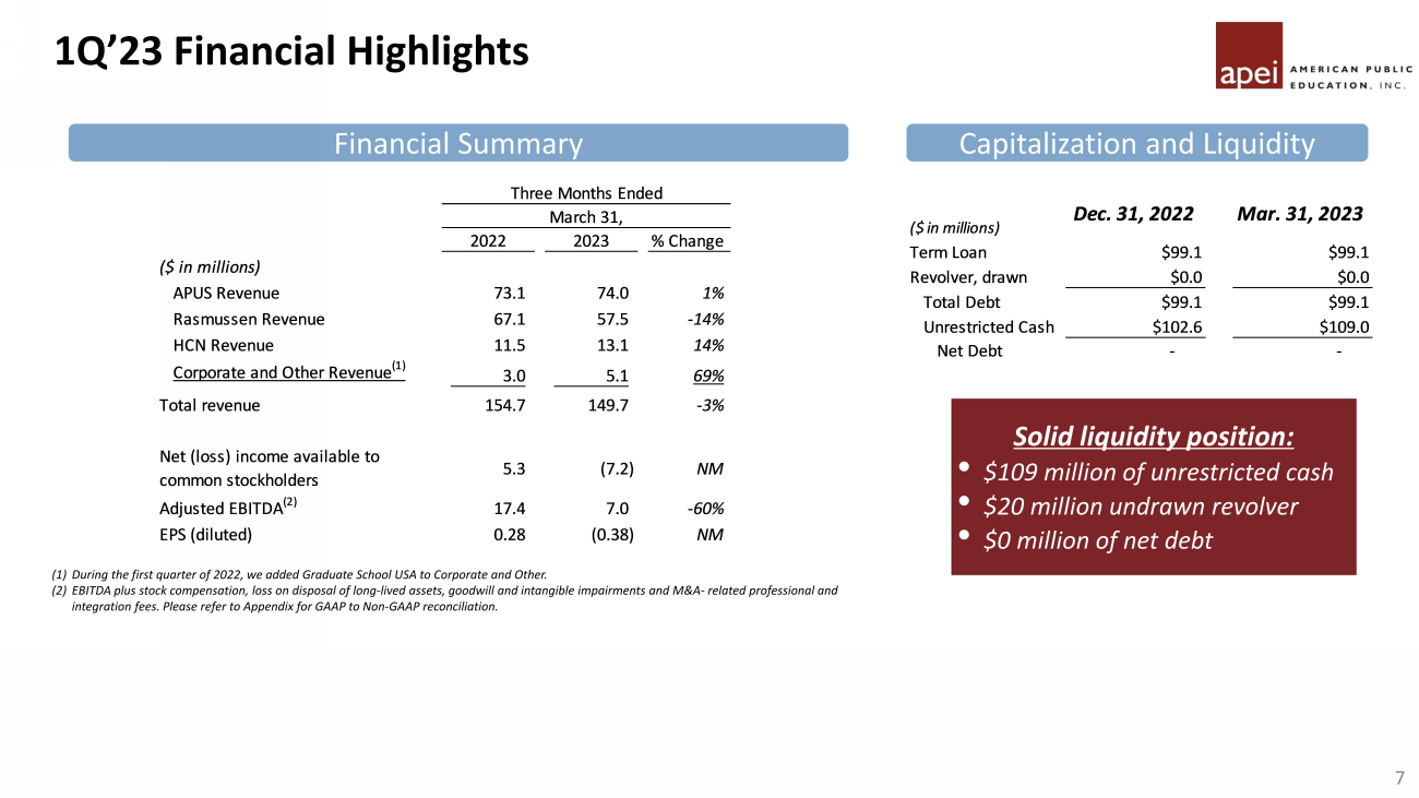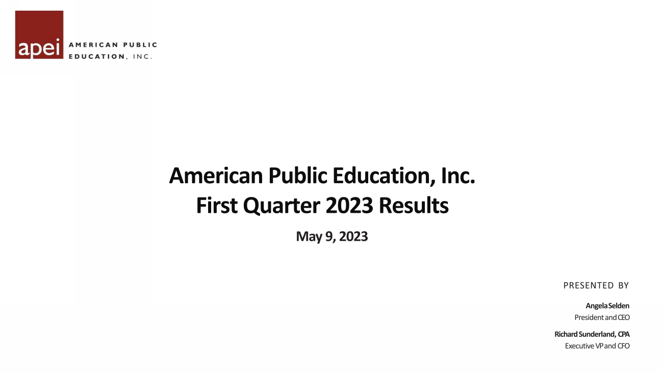 PRESENTED BY Angela Selden President and CEO Richard Sunderland, CPA Executive VP and CFO American Public Education, Inc. First Quarter 2023 Results May 9, 2023