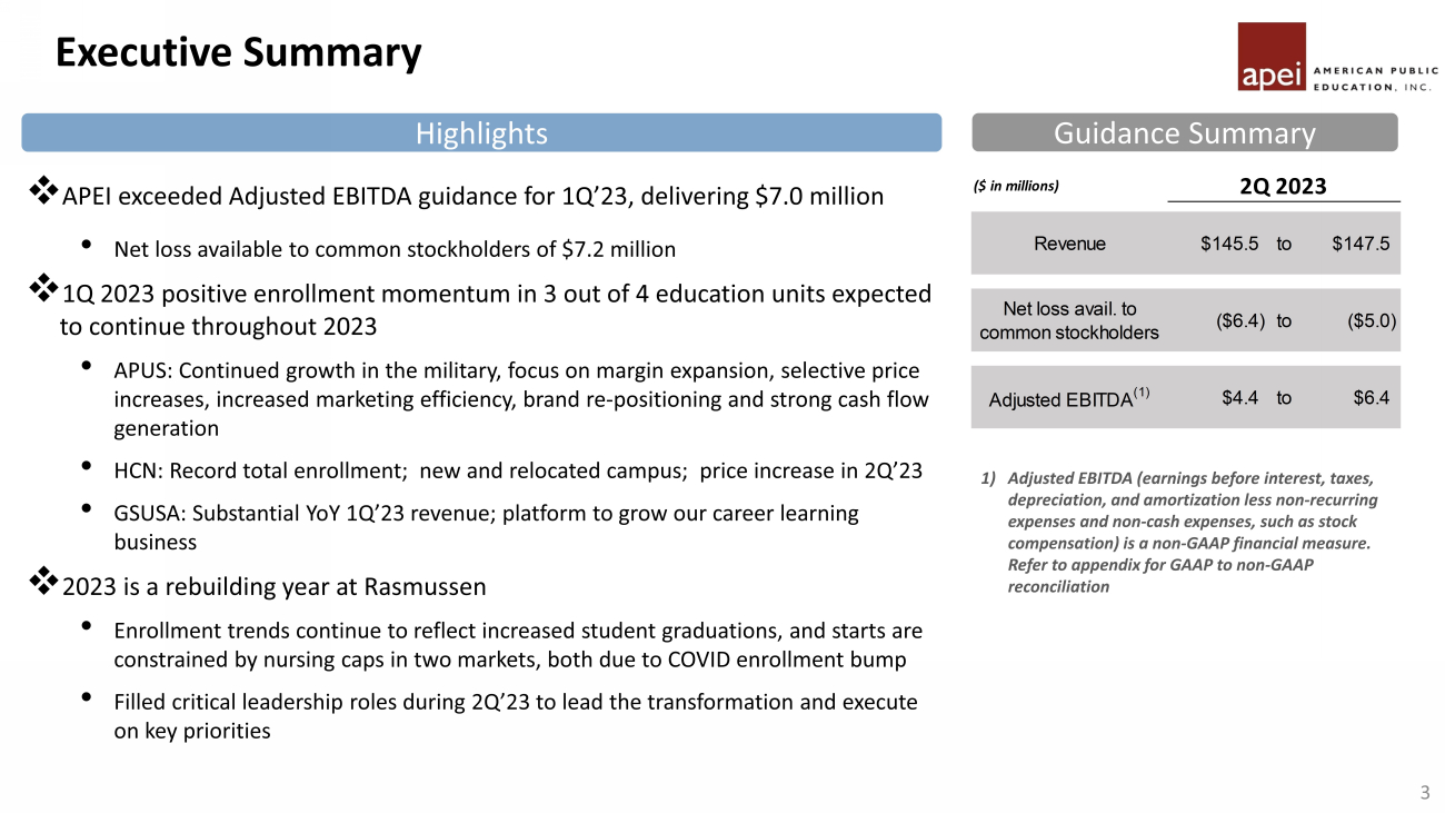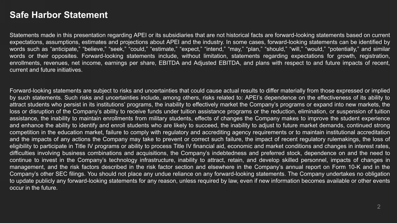 Safe Harbor Statement Statements made in this presentation regarding APEI or its subsidiaries that are not historical facts are forward - looking statements based on current expectations, assumptions, estimates and projections about APEI and the industry . In some cases, forward - looking statements can be identified by words such as “anticipate,” “believe,” “seek,” “could,” “estimate,” “expect,” “intend,” “may,” “plan,” “should,” “will,” “would,” “potentially,” and similar words or their opposites . Forward - looking statements include, without limitation, statements regarding expectations for growth, registration, enrollments, revenues, net income, earnings per share, EBITDA and Adjusted EBITDA, and plans with respect to and future impacts of recent, current and future initiatives . Forward - looking statements are subject to risks and uncertainties that could cause actual results to differ materially from those expressed or implied by such statements . Such risks and uncertainties include, among others, risks related to : APEI’s dependence on the effectiveness of its ability to attract students who persist in its institutions’ programs, the inability to effectively market the Company’s programs or expand into new markets, the loss or disruption of the Company’s ability to receive funds under tuition assistance programs or the reduction, elimination, or suspension of tuition assistance, the inability to maintain enrollments from military students, effects of changes the Company makes to improve the student experience and enhance the ability to identify and enroll students who are likely to succeed, the inability to adjust to future market demands, continued strong competition in the education market, failure to comply with regulatory and accrediting agency requirements or to maintain institutional accreditation and the impacts of any actions the Company may take to prevent or correct such failure, the impact of recent regulatory rulemakings, the loss of eligibility to participate in Title IV programs or ability to process Title IV financial aid, economic and market conditions and changes in interest rates, difficulties involving business combinations and acquisitions, the Company’s indebtedness and preferred stock, dependence on and the need to continue to invest in the Company’s technology infrastructure, inability to attract, retain, and develop skilled personnel, impacts of changes in management, and the risk factors described in the risk factor section and elsewhere in the Company’s annual report on Form 10 - K and in the Company’s other SEC filings . You should not place any undue reliance on any forward - looking statements . The Company undertakes no obligation to update publicly any forward - looking statements for any reason, unless required by law, even if new information becomes available or other events occur in the future . 2