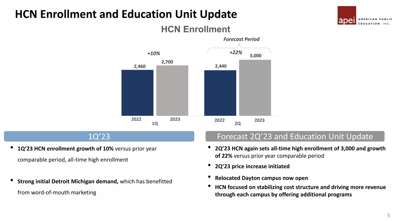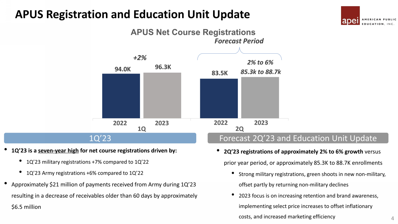 • 2Q’23 registrations of approximately 2% to 6% growth versus prior year period, or approximately 85.3K to 88.7K enrollments • Strong military registrations, green shoots in new non - military, offset partly by returning non - military declines • 2023 focus is on increasing retention and brand awareness, implementing select price increases to offset inflationary costs, and increased marketing efficiency APUS Registration and Education Unit Update 1Q’23 Forecast 2Q’23 and Education Unit Update 4 APUS Net Course Registrations 94.0K 83.5K 96.3K 1Q 2Q 2% to 6% Forecast Period 85.3k to 88.7k 2022 2023 2022 2023 +2% • 1Q’23 is a seven - year high for net course registrations driven by: • 1Q’23 military registrations +7% compared to 1Q’22 • 1Q’23 Army registrations +6% compared to 1Q’22 • Approximately $21 million of payments received from Army during 1Q’23 resulting in a decrease of receivables older than 60 days by approximately $6.5 million