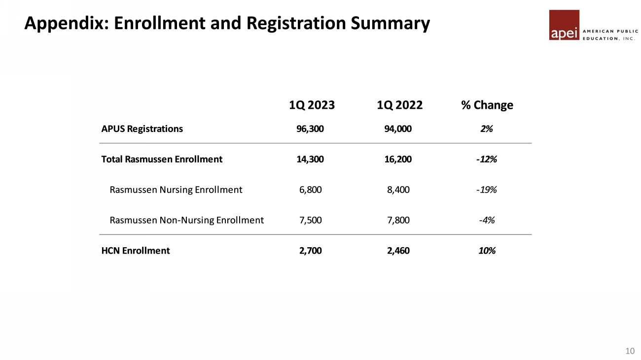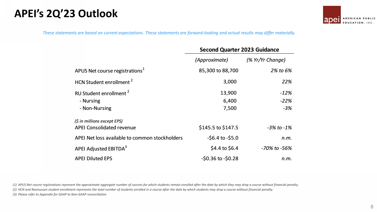 These statements are based on current expectations. These statements are forward - looking and actual results may differ materially. (1) APUS Net course registrations represent the approximate aggregate number of courses for which students remain enrolled after the date by which they may drop a course without financial penalty. (2) HCN and Rasmussen student enrollment represents the total number of students enrolled in a course after the date by which stu den ts may drop a course without financial penalty. (3) Please refer to Appendix for GAAP to Non - GAAP reconciliation APEI’s 2Q’23 Outlook 8 Second Quarter 2023 Guidance Full Year 2021 Guidance (Approximate) (% Yr/Yr Change) APUS Net course registrations 1 85,300 to 88,700 2% to 6% HCN Student enrollment 2 3,000 22% RU Student enrollment 2 13,900 -12% - Nursing 6,400 -22% - Non-Nursing 7,500 -3% ($ in millions except EPS) APEI Consolidated revenue $145.5 to $147.5 -3% to -1% APEI Net loss available to common stockholders -$6.4 to -$5.0 n.m. APEI Adjusted EBITDA 3 $4.4 to $6.4 -70% to -56% APEI Diluted EPS -$0.36 to -$0.28 n.m.