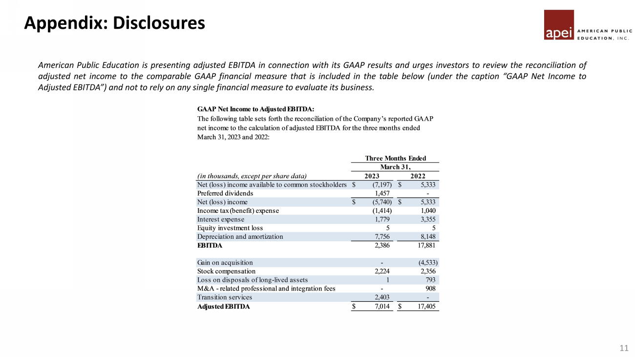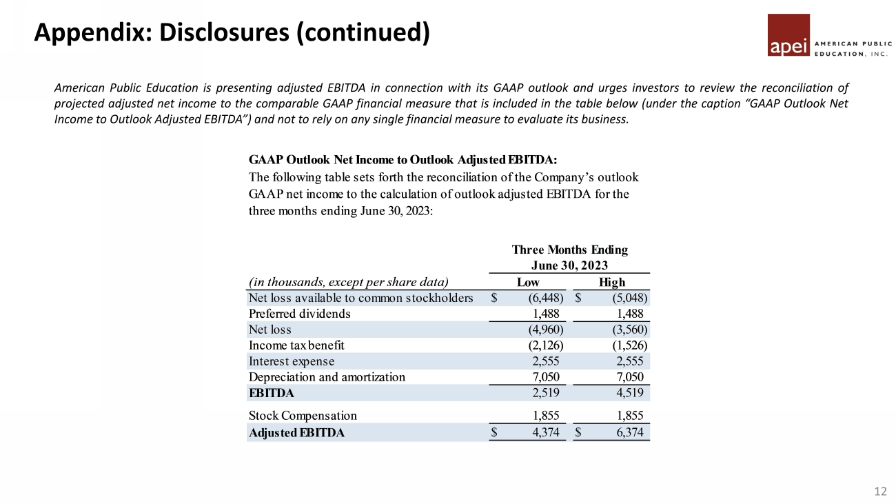 American Public Education is presenting adjusted EBITDA in connection with its GAAP results and urges investors to review the reconciliation of adjusted net income to the comparable GAAP financial measure that is included in the table below (under the caption “GAAP Net Income to Adjusted EBITDA”) and not to rely on any single financial measure to evaluate its business . Appendix: Disclosures 11 GAAP Net Income to Adjusted EBITDA:   (in thousands, except per share data)     Net (loss) income available to common stockholders $ (7,197) $ 5,333 Preferred dividends 1,457 - Net (loss) income $ (5,740) $ 5,333 Income tax (benefit) expense (1,414) 1,040 Interest expense 1,779 3,355 Equity investment loss 5 5 Depreciation and amortization 7,756 8,148 EBITDA 2,386 17,881 Gain on acquisition - (4,533) Stock compensation 2,224 2,356 Loss on disposals of long-lived assets 1 793 M&A - related professional and integration fees - 908 Transition services 2,403 - Adjusted EBITDA $ 7,014 $ 17,405 The following table sets forth the reconciliation of the Company’s reported GAAP net income to the calculation of adjusted EBITDA for the three months ended March 31, 2023 and 2022: Three Months Ended March 31, 2023 2022