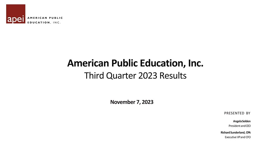 American Public Education, Inc. Third Quarter 2023 Results November 7, 2023 PRESENTED BY Angela Selden President and CEO Richard Sunderland, CPA Executive VP and CFO