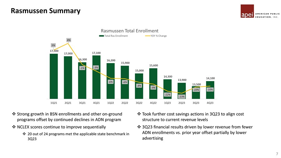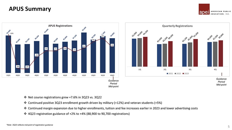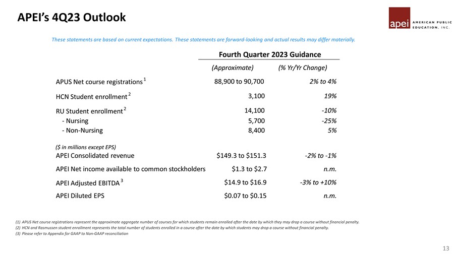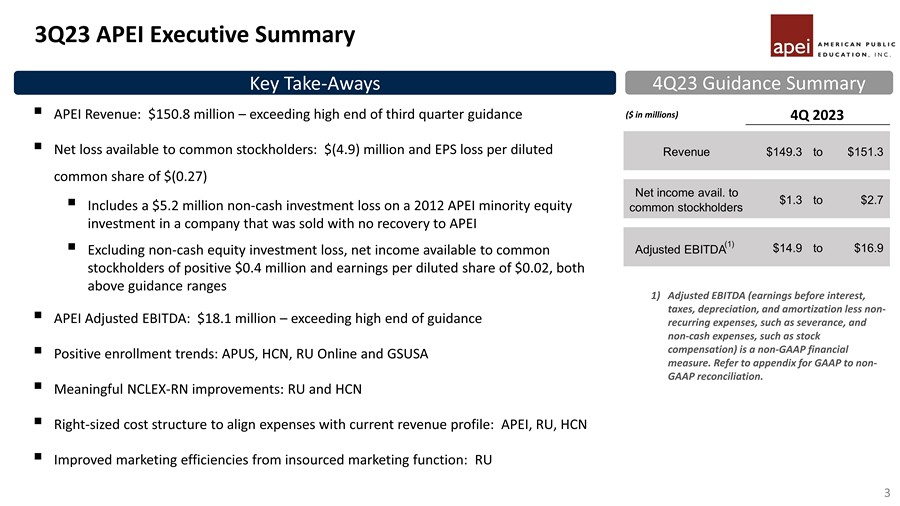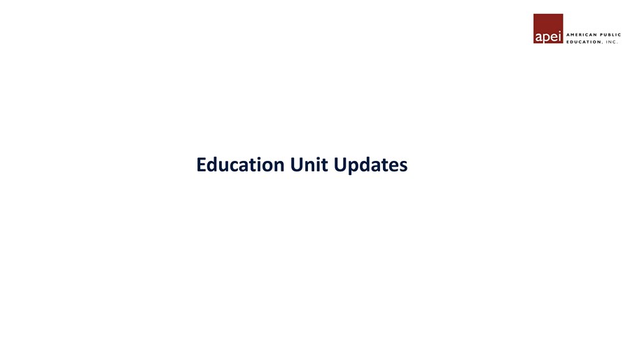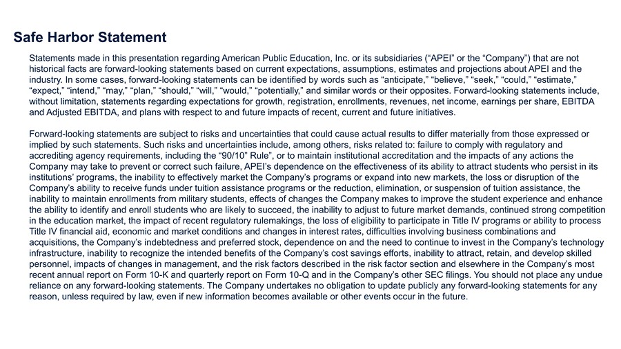 Safe Harbor Statement Statements made in this presentation regarding American Public Education, Inc. or its subsidiaries (“APEI” or the “Company”) tha t are not historical facts are forward - looking statements based on current expectations, assumptions, estimates and projections about APEI and the industry. In some cases, forward - looking statements can be identified by words such as “anticipate,” “believe,” “seek,” “could,” “estimate,” “expect,” “intend,” “may,” “plan,” “should,” “will,” “would,” “potentially,” and similar words or their opposites. Forward - looki ng statements include, without limitation, statements regarding expectations for growth, registration, enrollments, revenues, net income, earnings p er share, EBITDA and Adjusted EBITDA, and plans with respect to and future impacts of recent, current and future initiatives. Forward - looking statements are subject to risks and uncertainties that could cause actual results to differ materially from thos e expressed or implied by such statements. Such risks and uncertainties include, among others, risks related to: failure to comply with regu lat ory and accrediting agency requirements, including the “90/10” Rule”, or to maintain institutional accreditation and the impacts of a ny actions the Company may take to prevent or correct such failure, APEI’s dependence on the effectiveness of its ability to attract student s w ho persist in its institutions’ programs, the inability to effectively market the Company’s programs or expand into new markets, the loss or di sru ption of the Company’s ability to receive funds under tuition assistance programs or the reduction, elimination, or suspension of tuition ass istance, the inability to maintain enrollments from military students, effects of changes the Company makes to improve the student experie nce and enhance the ability to identify and enroll students who are likely to succeed, the inability to adjust to future market demands, cont inu ed strong competition in the education market, the impact of recent regulatory rulemakings, the loss of eligibility to participate in Title IV prog ram s or ability to process Title IV financial aid, economic and market conditions and changes in interest rates, difficulties involving business combina tio ns and acquisitions, the Company’s indebtedness and preferred stock, dependence on and the need to continue to invest in the Company ’s technology infrastructure, inability to recognize the intended benefits of the Company’s cost savings efforts, inability to attract, ret ain , and develop skilled personnel, impacts of changes in management, and the risk factors described in the risk factor section and elsewhere in the C omp any’s most recent annual report on Form 10 - K and quarterly report on Form 10 - Q and in the Company’s other SEC filings. You should not place any undue reliance on any forward - looking statements. The Company undertakes no obligation to update publicly any forward - looking statemen ts for any reason, unless required by law, even if new information becomes available or other events occur in the future.