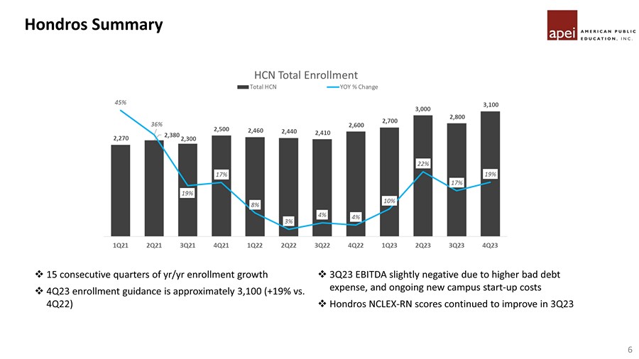 APUS Summary 5 *Note: 3Q23 reflects mid - point of registration guidance Guidance Period Mid - point □ Net course registrations grew +7.6% in 3Q23 vs. 3Q22 □ Continued positive 3Q23 enrollment growth driven by military (+12%) and veteran students (+5%) □ Continued margin expansion due to higher enrollments, tuition and fee increases earlier in 2023 and lower advertising costs □ 4Q23 registration guidance of +2% to +4% (88,900 to 90,700 registrations) Guidance Period Mid - point