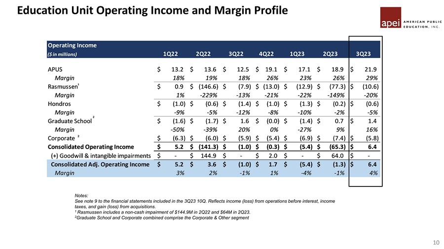 Revenue Summary by Education Unit 1 Graduate School USA includes nominal amount of corporate revenue eliminations 9 APEI Revenue » 3 of 4 Units delivering solid revenue growth » Double - digit revenue growth at APUS, HCN and GSUSA » RU revenue declined due primarily to lower ADN nursing enrollments 1 ($ in millions) 3Q22 3Q23 % Change YTD 9/30/2022 YTD 9/30/2023 % Change 68.7$ 76.4$ 11% 211.7$ 223.9$ 6% 61.5$ 52.1$ -15% 192.5$ 161.5$ -16% 11.4$ 13.7$ 20% 34.4$ 41.1$ 19% 7.8$ 8.6$ 10% 15.2$ 21.1$ 39% 149.5$ 150.8$ 1% 453.9$ 447.7$ -1%