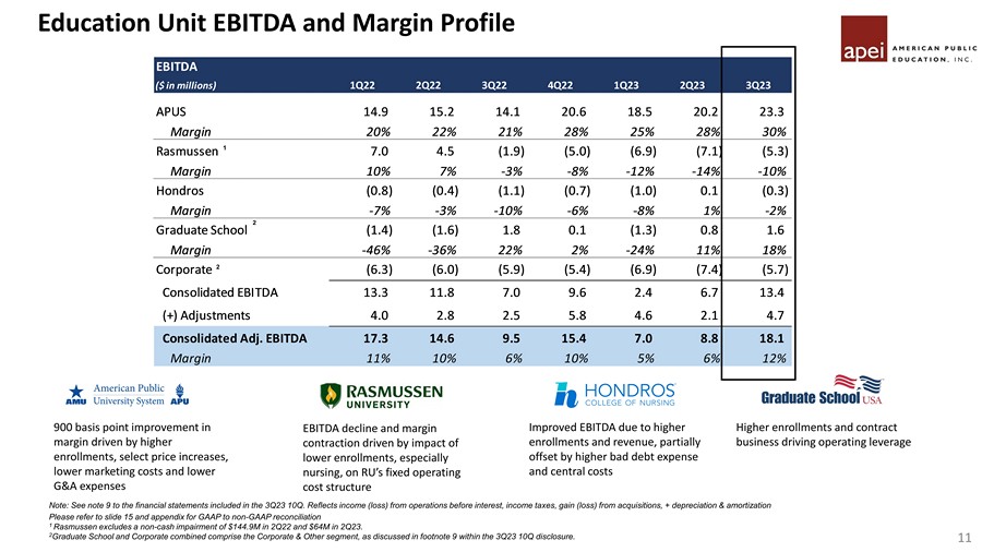 Education Unit Operating Income and Margin Profile 10 Notes: See note 9 to the financial statements included in the 3Q23 10Q. Reflects income (loss) from operations before interest, inco me taxes, and gain (loss) from acquisitions. 1 Rasmussen includes a non - cash impairment of $144.9M in 2Q22 and $64M in 2Q23. 2 Graduate School and Corporate combined comprise the Corporate & Other segment Operating Income ($ in millions) 1Q22 2Q22 3Q22 4Q22 1Q23 2Q23 3Q23 APUS 13.2$ 13.6$ 12.5$ 19.1$ 17.1$ 18.9$ 21.9$ Margin 18% 19% 18% 26% 23% 26% 29% Rasmussen 0.9$ (146.6)$ (7.9)$ (13.0)$ (12.9)$ (77.3)$ (10.6)$ Margin 1% -229% -13% -21% -22% -149% -20% Hondros (1.0)$ (0.6)$ (1.4)$ (1.0)$ (1.3)$ (0.2)$ (0.6)$ Margin -9% -5% -12% -8% -10% -2% -5% Graduate School (1.6)$ (1.7)$ 1.6$ (0.0)$ (1.4)$ 0.7$ 1.4$ Margin -50% -39% 20% 0% -27% 9% 16% Corporate (6.3)$ (6.0)$ (5.9)$ (5.4)$ (6.9)$ (7.4)$ (5.8)$ Consolidated Operating Income 5.2$ (141.3)$ (1.0)$ (0.3)$ (5.4)$ (65.3)$ 6.4$ (+) Goodwill & intangible impairments -$ 144.9$ -$ 2.0$ -$ 64.0$ -$ Consolidated Adj. Operating Income 5.2$ 3.6$ (1.0)$ 1.7$ (5.4)$ (1.3)$ 6.4$ Margin 3% 2% -1% 1% -4% -1% 4% 2 1 2