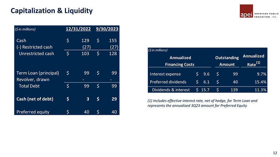 EBITDA ($ in millions) 1Q22 2Q22 3Q22 4Q22 1Q23 2Q23 3Q23 APUS 14.9 15.2 14.1 20.6 18.5 20.2 23.3 Margin 20% 22% 21% 28% 25% 28% 30% Rasmussen 7.0 4.5 (1.9) (5.0) (6.9) (7.1) (5.3) Margin 10% 7% -3% -8% -12% -14% -10% Hondros (0.8) (0.4) (1.1) (0.7) (1.0) 0.1 (0.3) Margin -7% -3% -10% -6% -8% 1% -2% Graduate School (1.4) (1.6) 1.8 0.1 (1.3) 0.8 1.6 Margin -46% -36% 22% 2% -24% 11% 18% Corporate (6.3) (6.0) (5.9) (5.4) (6.9) (7.4) (5.7) Consolidated EBITDA 13.3 11.8 7.0 9.6 2.4 6.7 13.4 (+) Adjustments 4.0 2.8 2.5 5.8 4.6 2.1 4.7 Consolidated Adj. EBITDA 17.3 14.6 9.5 15.4 7.0 8.8 18.1 Margin 11% 10% 6% 10% 5% 6% 12% Education Unit EBITDA and Margin Profile 11 900 basis point improvement in margin driven by higher enrollments, select price increases, lower marketing costs and lower G&A expenses EBITDA decline and margin contraction driven by impact of lower enrollments, especially nursing, on RU’s fixed operating cost structure Improved EBITDA due to higher enrollments and revenue, partially offset by higher bad debt expense and central costs Higher enrollments and contract business driving operating leverage Note: See note 9 to the financial statements included in the 3Q23 10Q. Reflects income (loss) from operations before interest, inco me taxes, gain (loss) from acquisitions, + depreciation & amortization Please refer to slide 15 and appendix for GAAP to non - GAAP reconciliation 1 Rasmussen excludes a non - cash impairment of $144.9M in 2Q22 and $64M in 2Q23. 2 Graduate School and Corporate combined comprise the Corporate & Other segment, as discussed in footnote 9 within the 3Q23 10Q di sclosure. 2 1 2