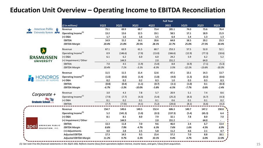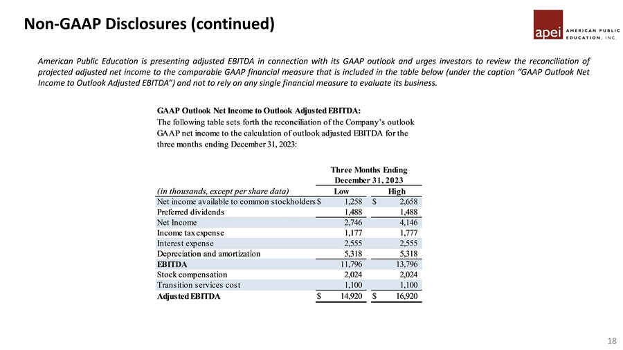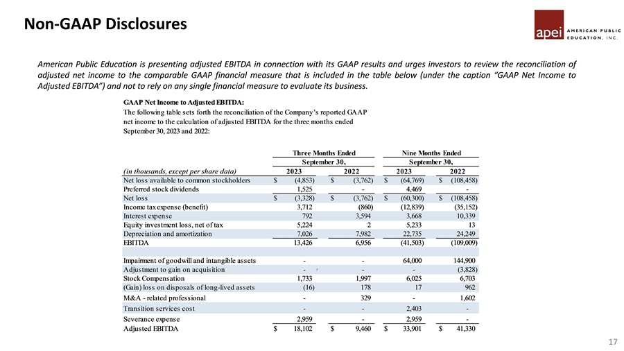 American Public Education is presenting adjusted EBITDA in connection with its GAAP results and urges investors to review the reconciliation of adjusted net income to the comparable GAAP financial measure that is included in the table below (under the caption “GAAP Net Income to Adjusted EBITDA”) and not to rely on any single financial measure to evaluate its business . Non - GAAP Disclosures 17 GAAP Net Income to Adjusted EBITDA:   (in thousands, except per share data)         Net loss available to common stockholders $ (4,853) $ (3,762) $ (64,769) $ (108,458) Preferred stock dividends 1,525 - 4,469 - Net loss $ (3,328) $ (3,762) $ (60,300) $ (108,458) Income tax expense (benefit) 3,712 (860) (12,839) (35,152) Interest expense 792 3,594 3,668 10,339 Equity investment loss, net of tax 5,224 2 5,233 13 Depreciation and amortization 7,026 7,982 22,735 24,249 EBITDA 13,426 6,956 (41,503) (109,009) Impairment of goodwill and intangible assets - - 64,000 144,900 Adjustment to gain on acquisition - 0 - - (3,828) Stock Compensation 1,733 1,997 6,025 6,703 (Gain) loss on disposals of long-lived assets (16) 178 17 962 M&A - related professional - 329 - 1,602 Transition services cost - - 2,403 - Severance expense 2,959 - 2,959 - Adjusted EBITDA $ 18,102 $ 9,460 $ 33,901 $ 41,330 Nine Months Ended September 30, 2023 2022 The following table sets forth the reconciliation of the Company’s reported GAAP net income to the calculation of adjusted EBITDA for the three months ended September 30, 2023 and 2022: Three Months Ended September 30, 2023 2022