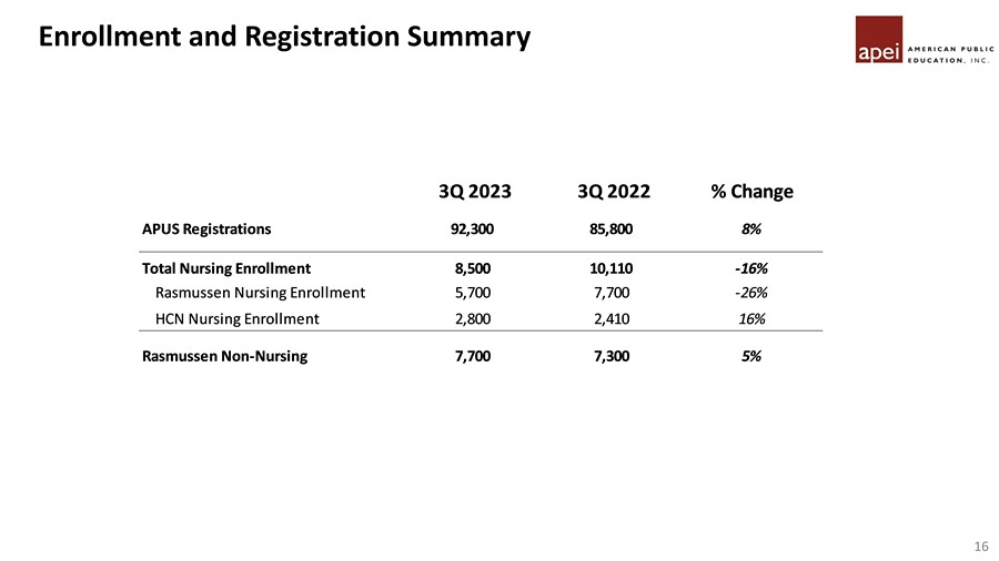 Education Unit Overview – Operating Income to EBITDA Reconciliation (1) See note 9 to the financial statements in the 3Q23 10Q. Reflects income (loss) from operations before interest, income taxes, an d gain / (loss) from acquisition. 15 Corporate + APEI Revenue Full Year ($ in millions) 1Q22 2Q22 3Q22 4Q22 2022 1Q23 2Q23 3Q23 Revenue 73.1 69.9 68.7 73.4 285.1 74.0 73.6 76.4 Operating Income (1) 13.2 13.6 12.5 19.1 58.5 17.1 18.9 21.9 (+) D&A 1.7 1.6 1.6 1.5 6.4 1.4 1.3 1.3 EBITDA 14.9 15.2 14.1 20.6 64.8 18.5 20.2 23.3 EBITDA Margin 20.4% 21.8% 20.5% 28.1% 22.7% 25.0% 27.5% 30.4% Revenue 67.1 63.9 61.5 60.7 253.3 57.5 52.0 52.1 Operating Income (1) 0.9 (146.6) (7.9) (13.0) (166.6) (12.9) (77.3) (10.6) (+) D&A 6.1 6.2 6.0 6.0 24.2 5.9 6.2 5.2 (+) Impairment / Other - 144.9 - 2.0 151.2 - 64.0 - EBITDA 7.0 4.5 (1.9) (5.0) 8.8 (6.9) (7.1) (5.3) EBITDA Margin 10.4% 7.1% -3.1% -8.3% 3.5% -12.1% -13.6% -10.3% Revenue 11.5 11.5 11.4 12.6 47.1 13.1 14.3 13.7 Operating Income (1) (1.0) (0.6) (1.4) (1.0) (4.0) (1.3) (0.2) (0.6) (+) D&A 0.2 0.2 0.2 0.3 1.0 0.3 0.3 0.3 EBITDA (0.8) (0.4) (1.1) (0.7) (3.1) (1.0) 0.1 (0.3) EBITDA Margin -6.7% -3.3% -10.0% -5.8% -6.5% -7.7% 0.6% -2.4% Revenue 3.0 4.3 7.8 5.7 20.9 5.1 7.4 8.6 Operating Income (1) (7.9) (7.7) (4.3) (5.4) (25.2) (8.3) (6.7) (4.3) (+) D&A 0.1 0.2 0.1 0.1 0.6 0.1 0.1 0.2 EBITDA (7.7) (7.55) (4.1) (5.2) (24.6) (8.1) (6.6) (4.2) Revenue 154.7 149.6 149.5 152.4 606.3 149.7 147.2 150.8 Operating Income (1) 5.2 (141.3) (1.0) (0.3) (137.3) (5.4) (65.3) 6.4 (+) D&A 8.1 8.1 8.0 7.9 32.1 7.8 8.0 7.0 (+) Impairment / Other - 144.9 - 2.0 151.2 - 64.0 - EBITDA 13.3 11.8 7.0 9.6 46.0 2.4 6.7 13.4 EBITDA Margin 8.6% 7.9% 4.7% 6.3% 7.6% 1.6% 4.5% 8.9% (+) Adjustments 4.0 2.8 2.5 5.8 11.2 4.6 2.1 4.7 Adjusted EBITDA 17.3 14.5 9.5 15.4 57.2 7.0 8.8 18.1 Adjusted EBITDA Margin 11.2% 9.7% 6.3% 10.1% 9.4% 4.7% 6.0% 12.0%