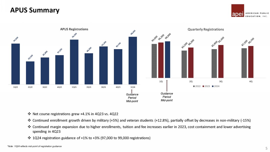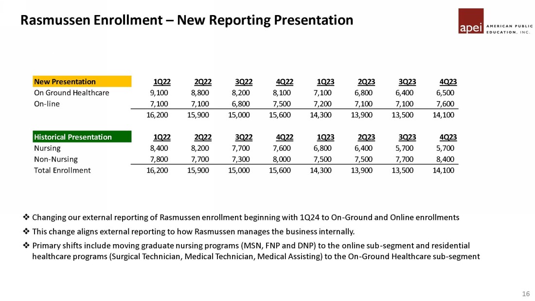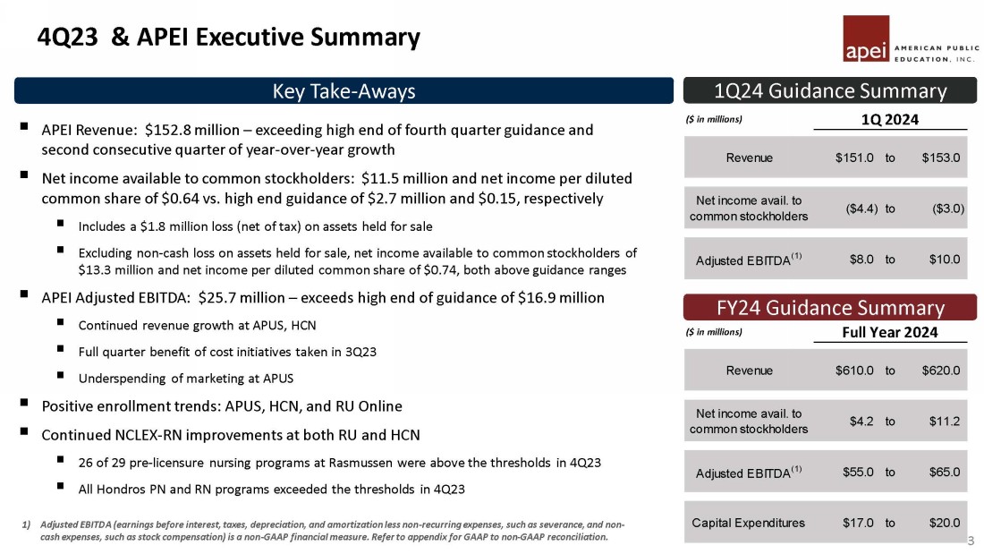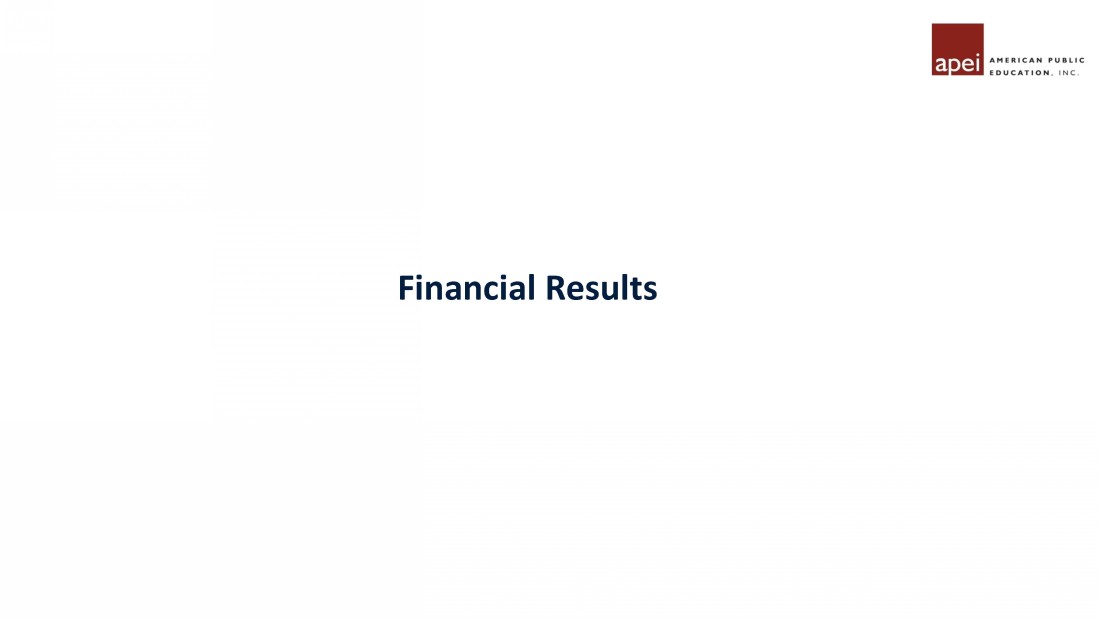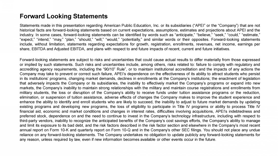 Forward Looking Statements Statements made in this presentation regarding American Public Education, Inc . or its subsidiaries (“APEI” or the “Company”) that are not historical facts are forward - looking statements based on current expectations, assumptions, estimates and projections about APEI and the industry . In some cases, forward - looking statements can be identified by words such as “anticipate,” “believe,” “seek,” “could,” “estimate,” “expect,” “intend,” “may,” “plan,” “should,” “will,” “would,” “potentially,” and similar words or their opposites . Forward - looking statements include, without limitation, statements regarding expectations for growth, registration, enrollments, revenues, net income, earnings per share, EBITDA and Adjusted EBITDA, and plans with respect to and future impacts of recent, current and future initiatives . Forward - looking statements are subject to risks and uncertainties that could cause actual results to differ materially from those expressed or implied by such statements . Such risks and uncertainties include, among others, risks related to : failure to comply with regulatory and accrediting agency requirements, including the “ 90 / 10 ” Rule”, or to maintain institutional accreditation and the impacts of any actions the Company may take to prevent or correct such failure, APEI’s dependence on the effectiveness of its ability to attract students who persist in its institutions’ programs, changing market demands, declines in enrollments at the Company’s institutions ; the enactment of legislation that adversely impacts the Company or its subsidiaries, the inability to effectively market the Company’s programs or expand into new markets, the Company’s inability to maintain strong relationships with the military and maintain course registrations and enrollments from military students, the loss or disruption of the Company’s ability to receive funds under tuition assistance programs or the reduction, elimination, or suspension of tuition assistance, adverse effects of changes the Company makes to improve the student experience and enhance the ability to identify and enroll students who are likely to succeed, the inability to adjust to future market demands by updating existing programs and developing new programs, the loss of eligibility to participate in Title IV programs or ability to process Title IV financial aid, economic and market conditions and changes in interest rates, difficulties involving acquisitions, APEI’s indebtedness and preferred stock, dependence on and the need to continue to invest in the Company’s technology infrastructure, including with respect to third - party vendors, inability to recognize the anticipated benefits of the Company’s cost savings efforts, the Company’s ability to manage and limit its exposure to its bad debt, and the risk factors described in the risk factor section and elsewhere in the Company’s most recent annual report on Form 10 - K and quarterly report on Form 10 - Q and in the Company’s other SEC filings . You should not place any undue reliance on any forward - looking statements . The Company undertakes no obligation to update publicly any forward - looking statements for any reason, unless required by law, even if new information becomes available or other events occur in the future .