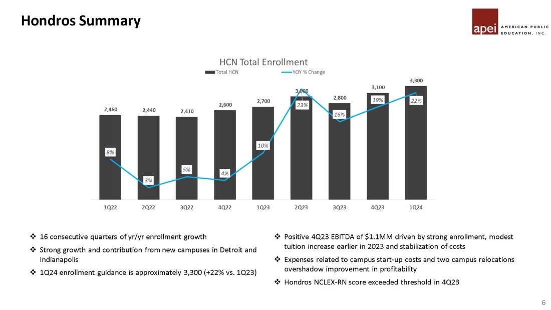 APUS Summary 5 *Note: 1Q24 reflects mid - point of registration guidance Guidance Period Mid - point □ Net course registrations grew +4.1% in 4Q23 vs. 4Q22 □ Continued enrollment growth driven by military (+5%) and veteran students (+12.8%), partially offset by decreases in non - militar y ( - 15%) □ Continued margin expansion due to higher enrollments, tuition and fee increases earlier in 2023, cost containment and lower adve rtising spending in 4Q23 □ 1Q24 registration guidance of +1% to +3% (97,000 to 99,000 registrations) Guidance Period Mid - point