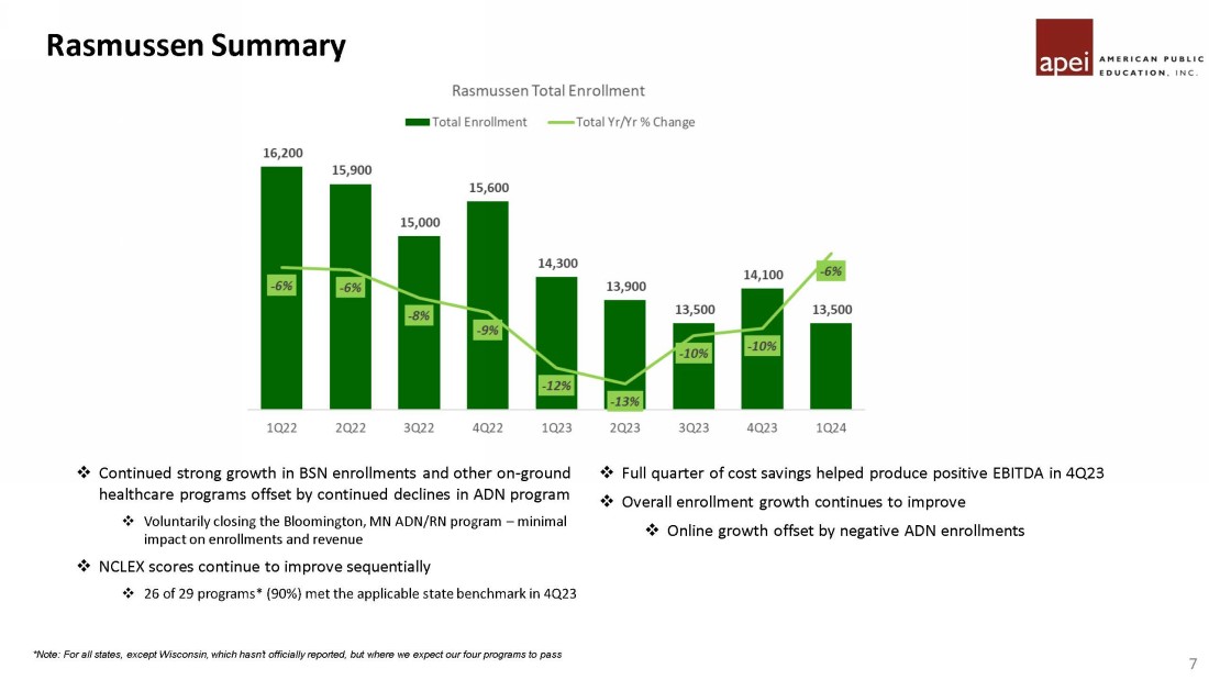 Hondros Summary 6 □ 16 consecutive quarters of yr / yr enrollment growth □ Strong growth and contribution from new campuses in Detroit and Indianapolis □ 1Q24 enrollment guidance is approximately 3,300 (+22% vs. 1Q23) □ Positive 4Q23 EBITDA of $1.1MM driven by strong enrollment, modest tuition increase earlier in 2023 and stabilization of costs □ Expenses related to campus start - up costs and two campus relocations overshadow improvement in profitability □ Hondros NCLEX - RN score exceeded threshold in 4Q23