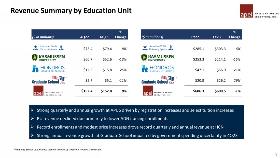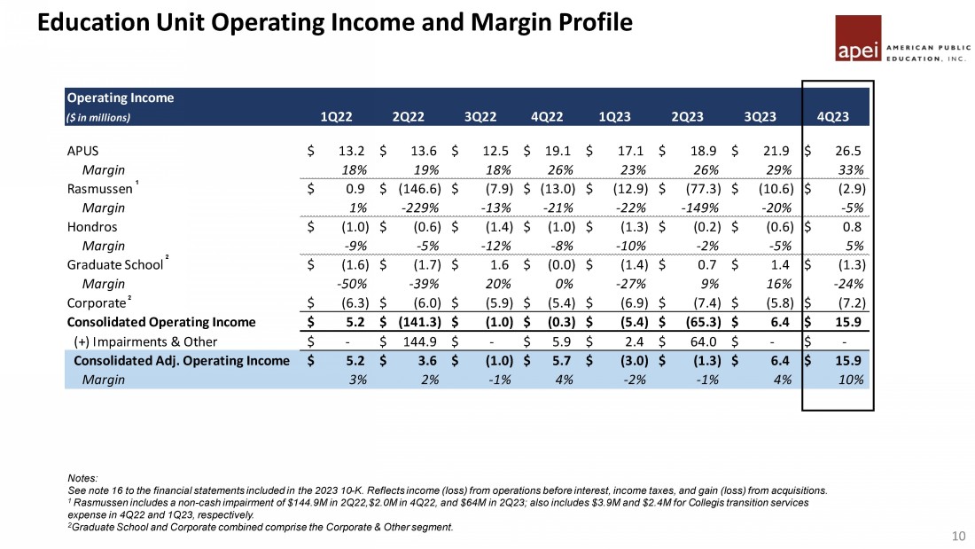 ($ in millions) 4Q22 4Q23 % Change ($ in millions) FY22 FY23 % Change $73.4 $79.4 8% $285.1 $303.3 6% $60.7 $52.6 -13% $253.3 $214.1 -15% $12.6 $15.8 25% $47.1 $56.9 21% $5.7 $5.1 -11% $20.9 $26.2 26% $152.4 $152.8 0% $606.3 $600.5 -1% Revenue Summary by Education Unit 1 Graduate School USA includes nominal amount of corporate revenue eliminations 9 APEI Revenue » Strong quarterly and annual growth at APUS driven by registration increases and select tuition increases » RU revenue declined due primarily to lower ADN nursing enrollments » Record enrollments and modest price increases drove record quarterly and annual revenue at HCN » Strong annual revenue growth at Graduate School impacted by government spending uncertainty in 4Q23 1 1