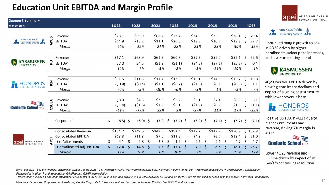 Operating Income ($ in millions) 1Q22 2Q22 3Q22 4Q22 1Q23 2Q23 3Q23 4Q23 APUS 13.2$ 13.6$ 12.5$ 19.1$ 17.1$ 18.9$ 21.9$ 26.5$ Margin 18% 19% 18% 26% 23% 26% 29% 33% Rasmussen 0.9$ (146.6)$ (7.9)$ (13.0)$ (12.9)$ (77.3)$ (10.6)$ (2.9)$ Margin 1% -229% -13% -21% -22% -149% -20% -5% Hondros (1.0)$ (0.6)$ (1.4)$ (1.0)$ (1.3)$ (0.2)$ (0.6)$ 0.8$ Margin -9% -5% -12% -8% -10% -2% -5% 5% Graduate School (1.6)$ (1.7)$ 1.6$ (0.0)$ (1.4)$ 0.7$ 1.4$ (1.3)$ Margin -50% -39% 20% 0% -27% 9% 16% -24% Corporate (6.3)$ (6.0)$ (5.9)$ (5.4)$ (6.9)$ (7.4)$ (5.8)$ (7.2)$ Consolidated Operating Income 5.2$ (141.3)$ (1.0)$ (0.3)$ (5.4)$ (65.3)$ 6.4$ 15.9$ (+) Impairments & Other -$ 144.9$ -$ 5.9$ 2.4$ 64.0$ -$ -$ Consolidated Adj. Operating Income 5.2$ 3.6$ (1.0)$ 5.7$ (3.0)$ (1.3)$ 6.4$ 15.9$ Margin 3% 2% -1% 4% -2% -1% 4% 10% Education Unit Operating Income and Margin Profile 10 Notes: See note 16 to the financial statements included in the 2023 10 - K. Reflects income (loss) from operations before interest, incom e taxes, and gain (loss) from acquisitions. 1 Rasmussen includes a non - cash impairment of $144.9M in 2Q22,$2.0M in 4Q22, and $64M in 2Q23; also includes $3.9M and $2.4M for C ollegis transition services expense in 4Q22 and 1Q23, respectively. 2 Graduate School and Corporate combined comprise the Corporate & Other segment. 1 2 2